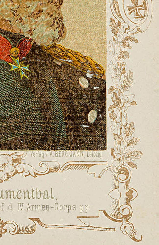 • Beschreibung: Unter dem Bild mit dem Namen und Angaben des Dargestellten “Graf von Blumenthal. General v. d. Infanterie, Chef d IV. Armee-Corps pp” bezeichnet.