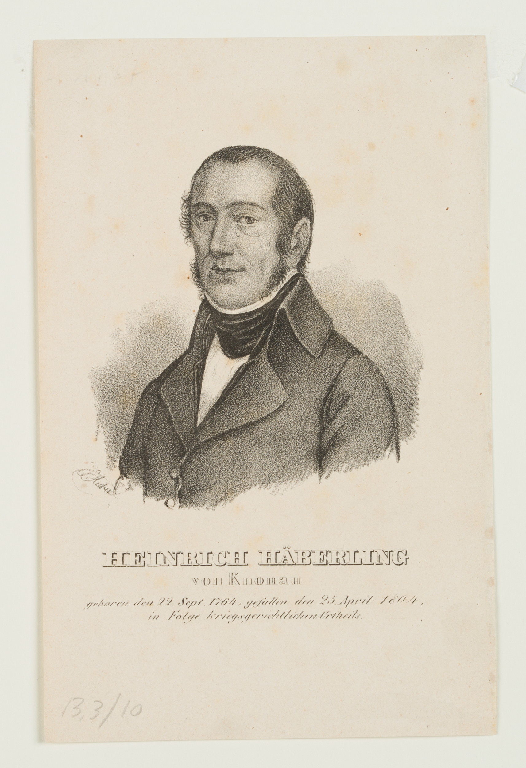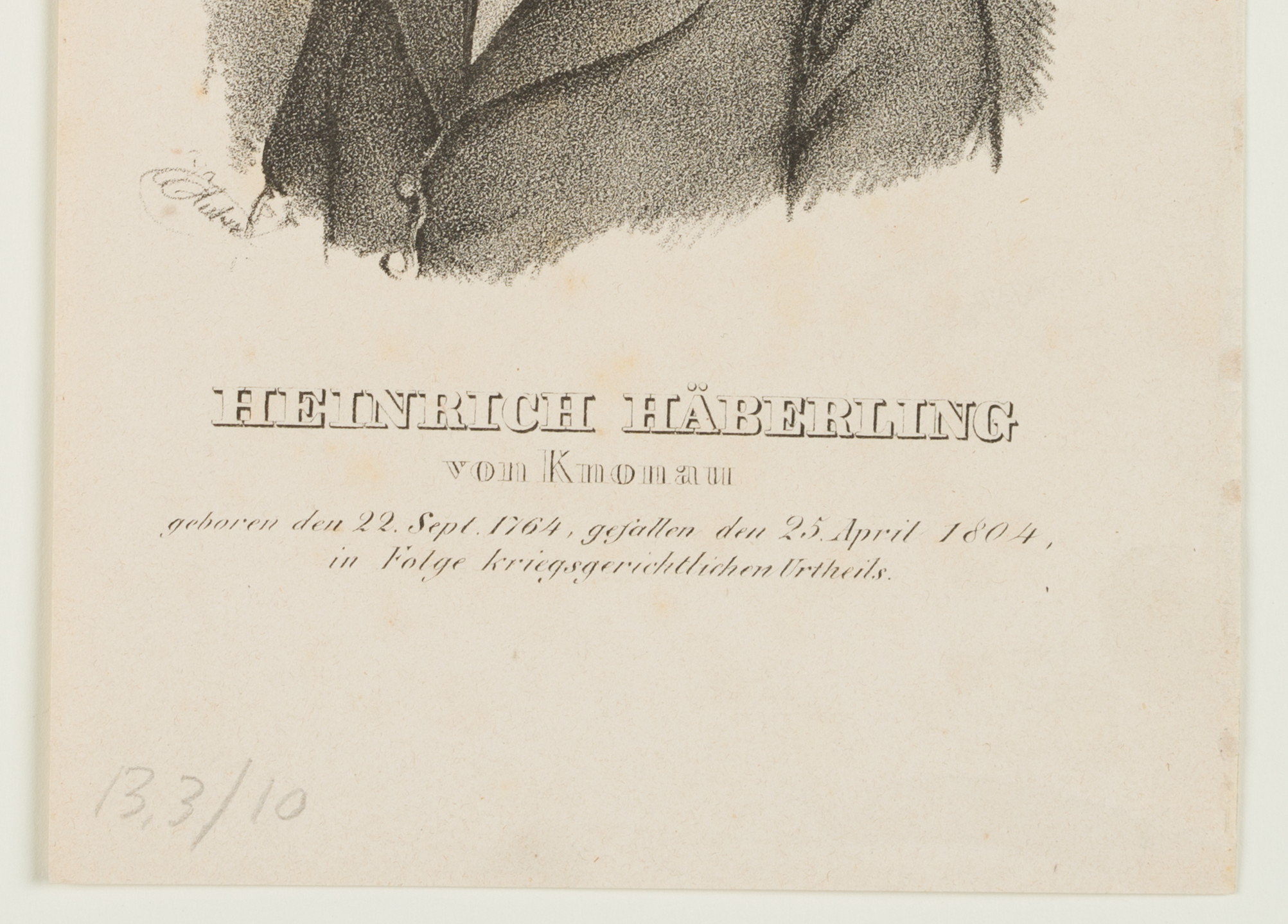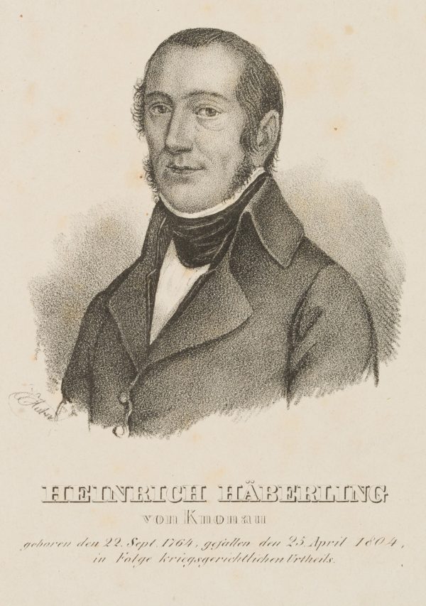 - Inscription: lower left signed in the printing plate: “Kurtz[?]”. Lower middle inscribed in the printing plate: “Heinrich Häberling von Knonau geboren den 22. Sept 1764, gefallen den 25. April 1804 in Folge kriegsgerichtlichen Urtheils”.