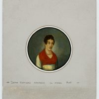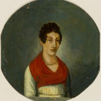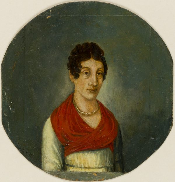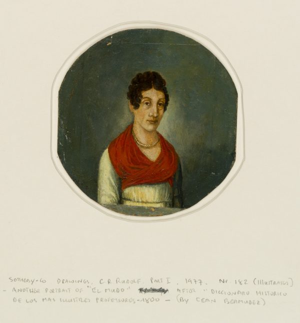 - Description: Oval portrait of a lady dressed in the style of Empire fashion with loosely pinned up hair, white dress with high waist and red shawl. An old attribution in pencil on the cover of the mount attributes the portrait to the Spanish Renaissance artist Juan Fernandez NAVARRETE (Logronyo 1526 – Toledo 1579): “JUAN FERNANDEZ NAVARRETE EL MUDO PINT -“. Inscribed at the lower margin of the mount inside with: SOTHEBY-Co DRAWINGS. C. R. RUDOLF. PART I. 1977. no. 182 (illustrator) – AN OTHER PORTRAIT OF “EL MUDO” AFTER ” DICCIONARIO HISTORICO DE LOS MAS ILLUSTRES PROFESSURES – 1800 – (BY CEAN BERMUDEZ)”.