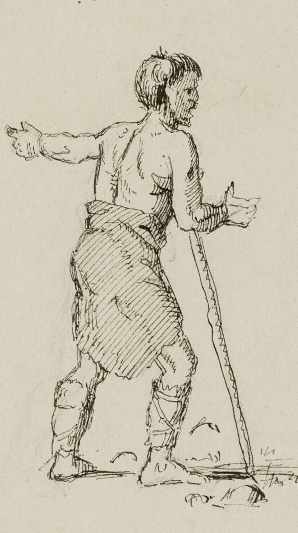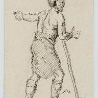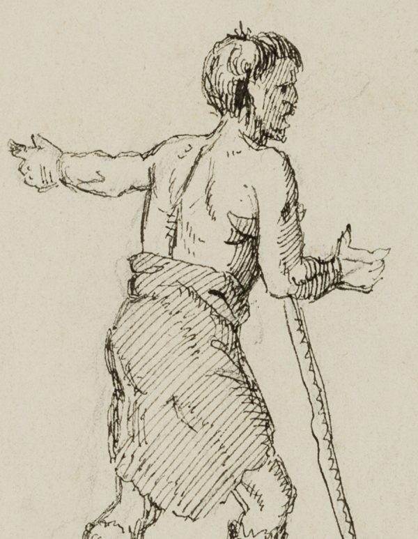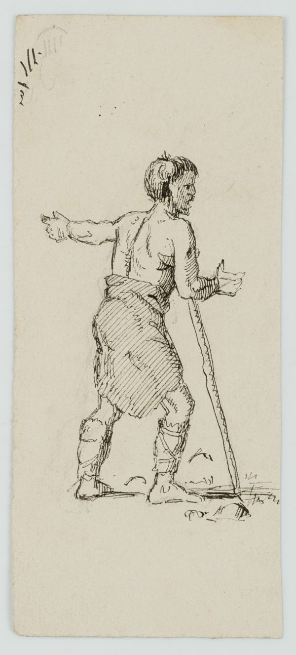 - Beschreibung: Bei dem jungen Mann im Rock und römischen Sandalen könnte es sich um einen Invaliden handeln, der nach einem Kriegsunfall auf eine Gehilfe angewiesen ist. Rückseitig mit der Porträtskizze eines Männerkopfes.