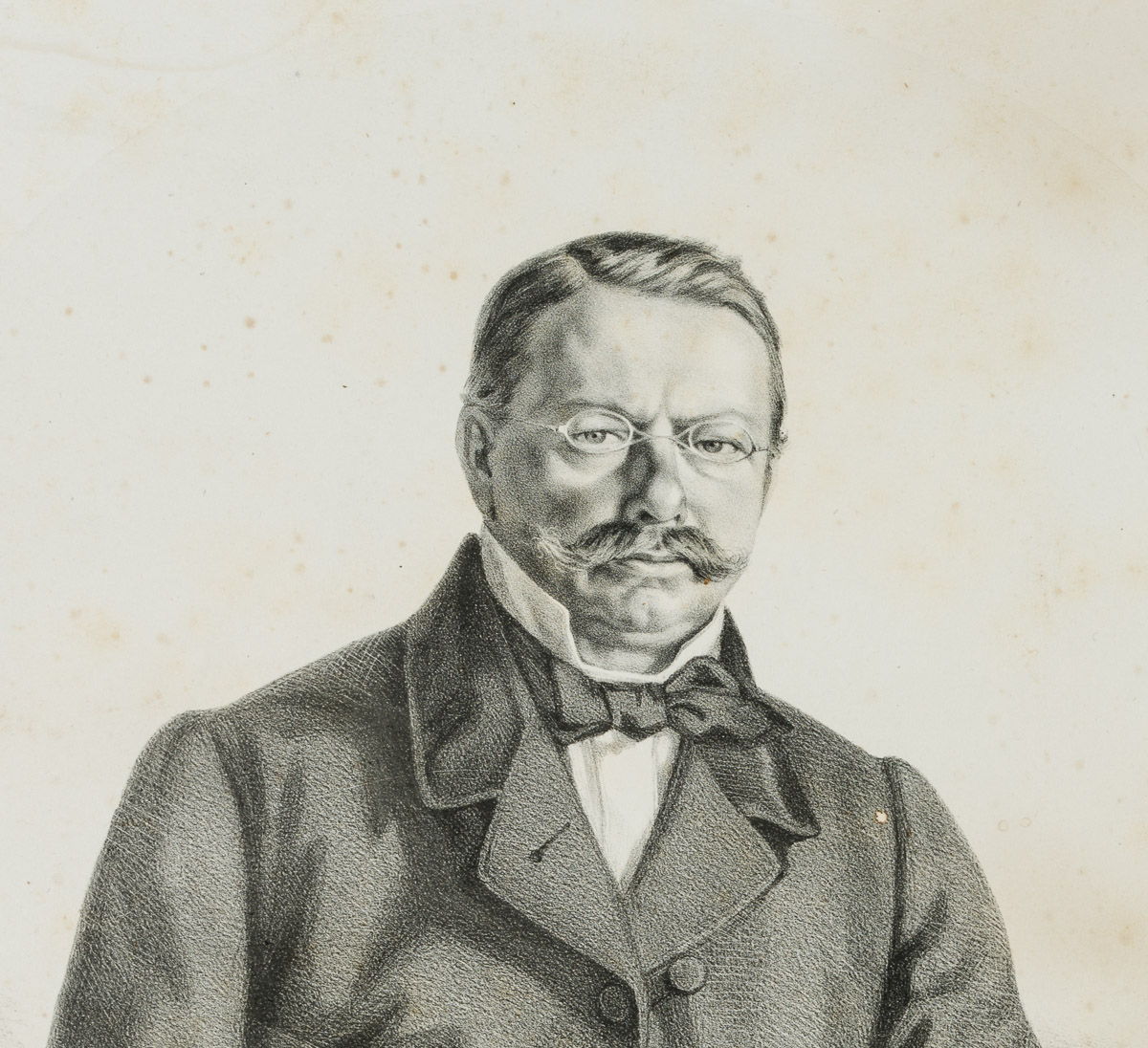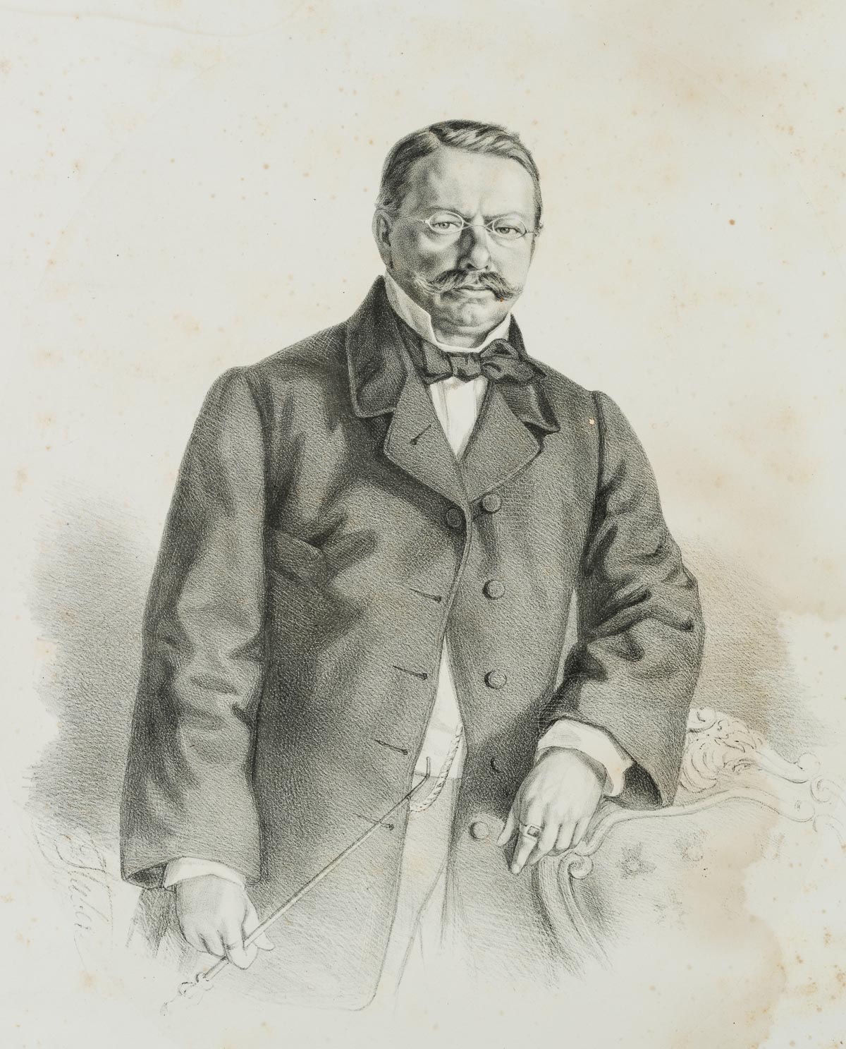 - Beschreibung: Kniestück, das einen Mann mittleren Alters zeigt, mit Schnauzbart, Brille und vornehmer Kleidung. An seinem linken Zeigefinger trägt der Mann einen Siegelring, in seiner rechten Hand hält er eine lange Pfeife.