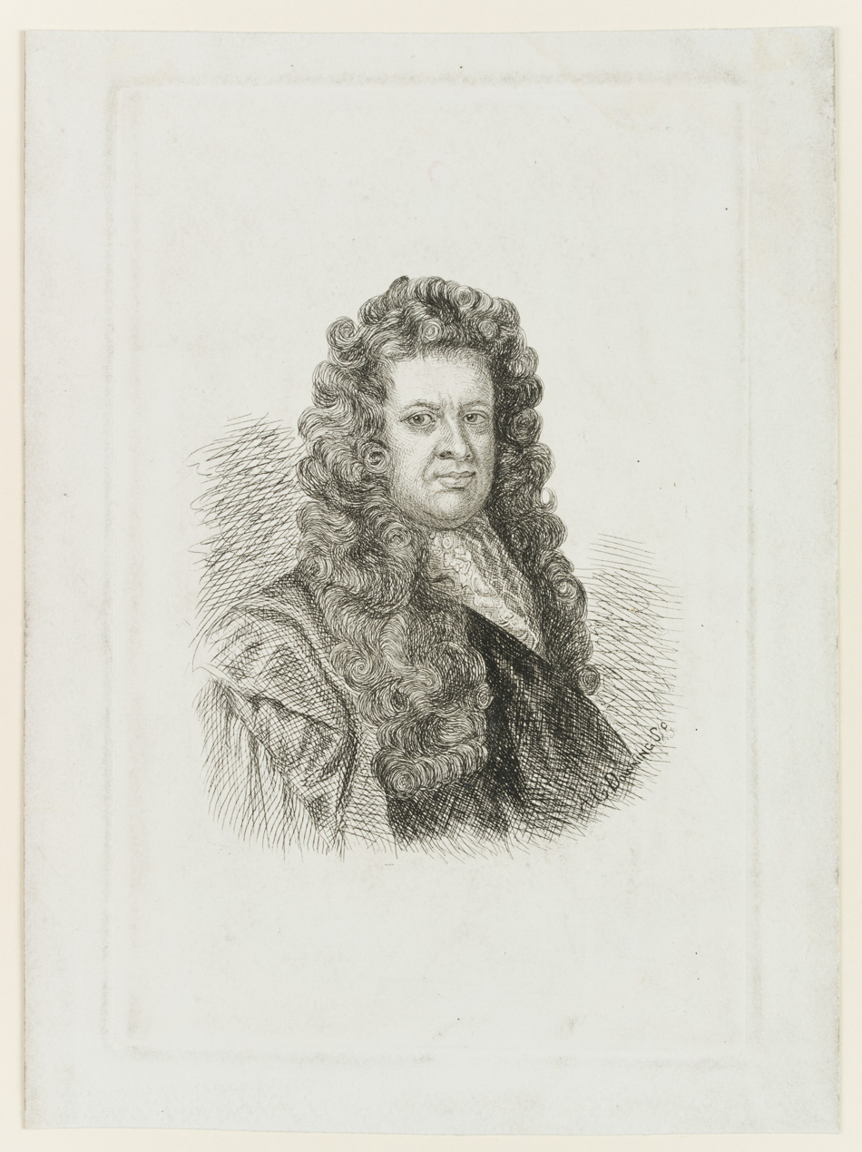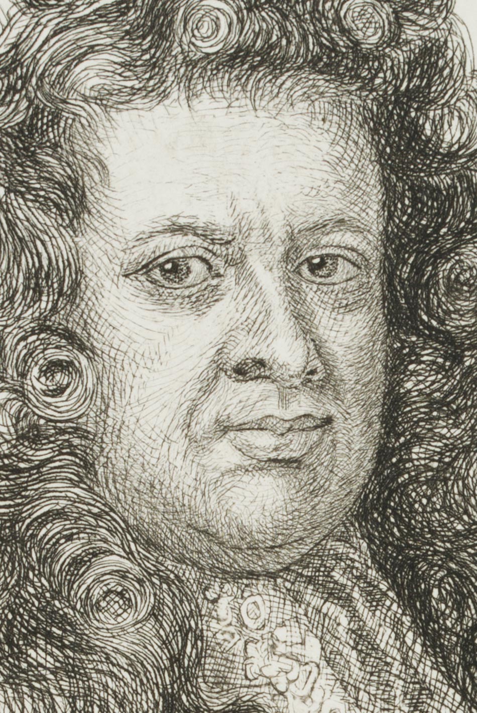 • Beschreibung: Brustbild im Halbprofil eines Mannes mit üppiger Lockenperücke und würdevollem Gesichtsausdruck.