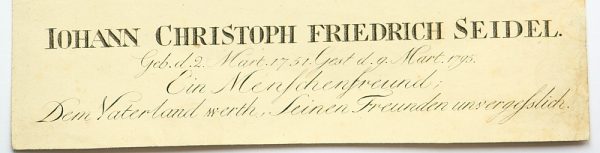 - Beschreibung: Porträt des Johann Christoph Friedrich Seidel (1751 – 1795) Ein Menschenfreund, Lithographie. Beschreibung:Lithographie auf Papier. Unterhalb der Darstellung im Stein beschriftet.