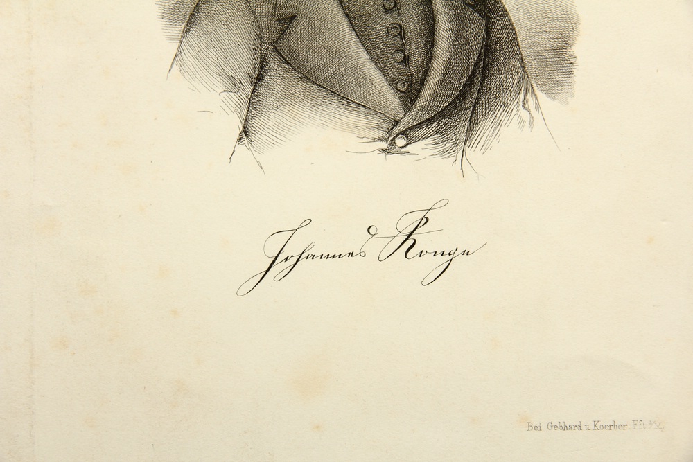 • Inscription: The sitter’s signature in his own hand can be found in the printing plate below the depiction. At the bottom right there is a reference to the publishing house Gebhard und Koerber in Frankfurt am Main.