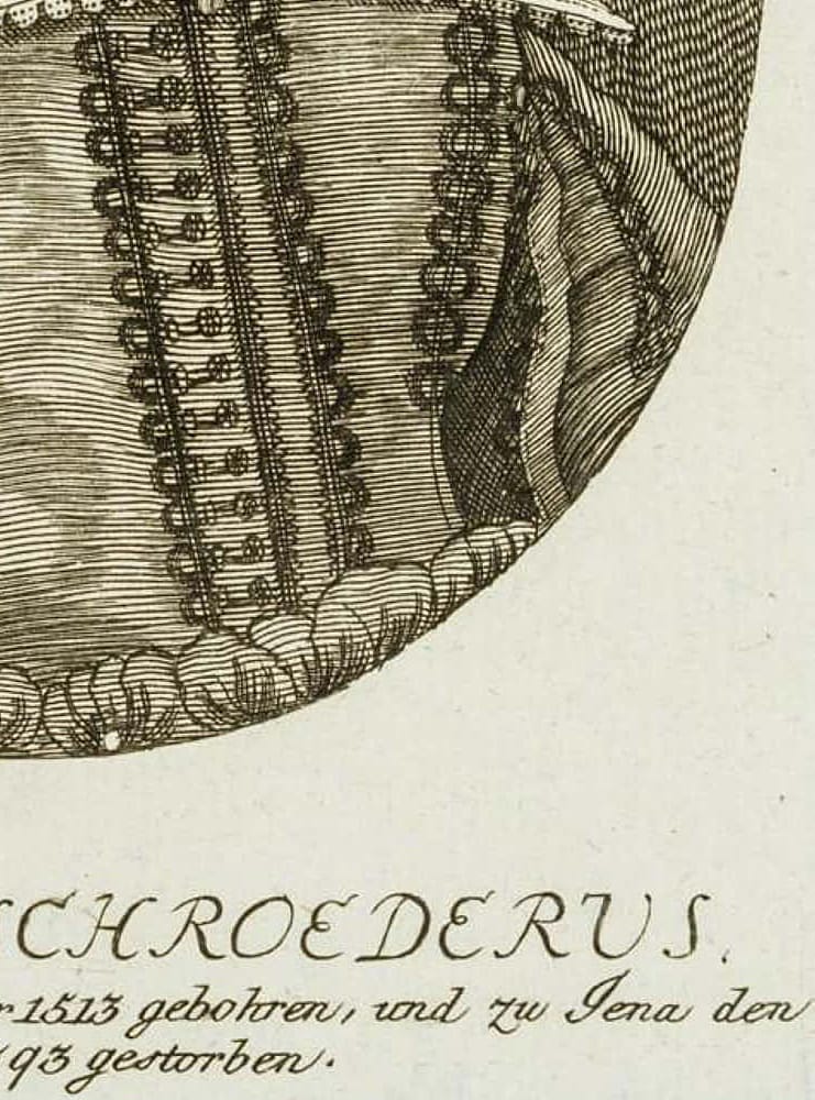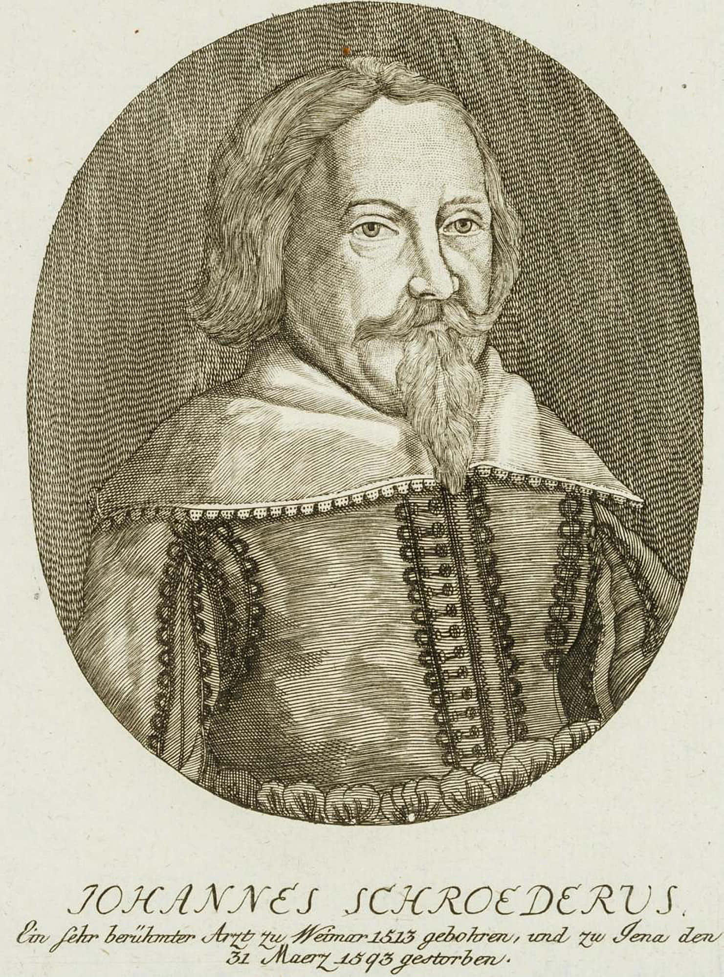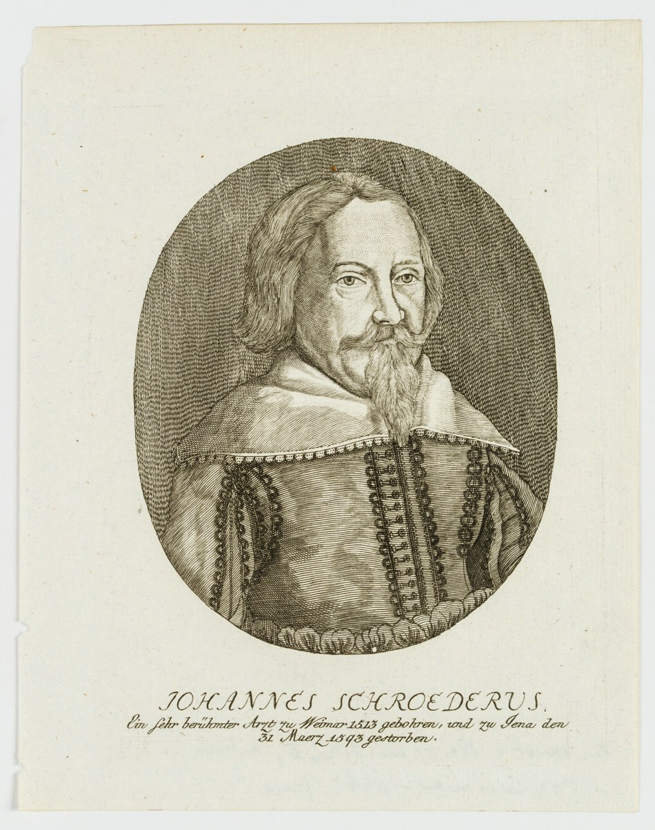- Beschreibung: Unter dem Bild mit Namen des Dargestellten “JOHANNES SCHROEDERUS” und dessen Lebensdaten bezeichnet.