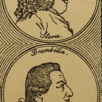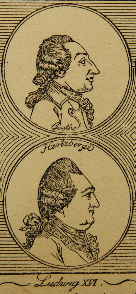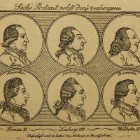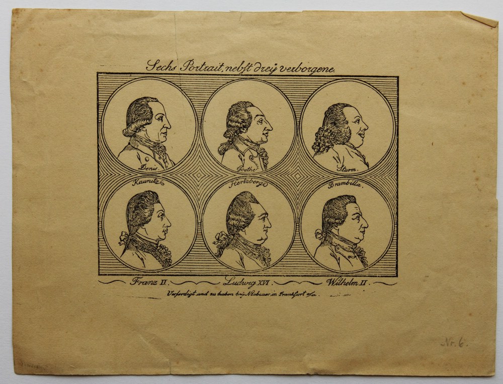 - Description: Inscribed “Sechs Portrait nebst drey verborgene” (“Six portraits along with three hidden ones”) in the margin of the image. Depiction shows portraits of Denis Diderot (1713 Langres – 1784 Paris, writer and philosopher), Johann Wolfgang von Goethe (1749 Frankfurt am Main – 1832 Weimar, poet), Johann Christoph Sturm (1635 Hilpolstein – 1703 Altdorf, astronomer and philosopher),Aloys von Kaunitz-Rietberg[?] (1774 Vienna – 1848 Paris, diplomat),Hertzberger and Giovanni Alessandro Brambilla[?] (1728 San Zenone al Po – 1800 Padua, physician). Hidden from view are the depictions of Francis II. (1768 Florence – 1835 Vienna, Holy Roman Emperor), Louis XVI (1754 Versailles – 1793 Paris, King of France) and William II of Orange Nassau [?] (1792 The Hague – 1849 Tilburg, King of the Netherlands).