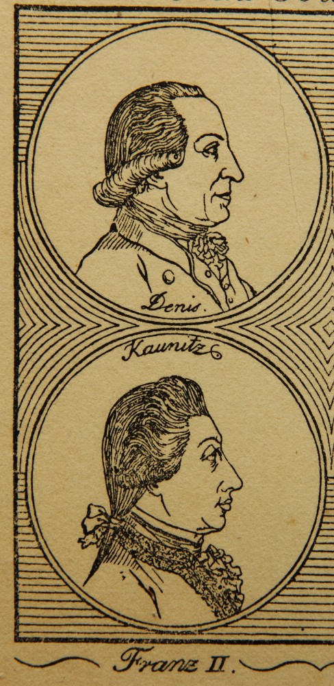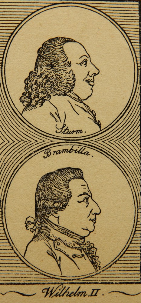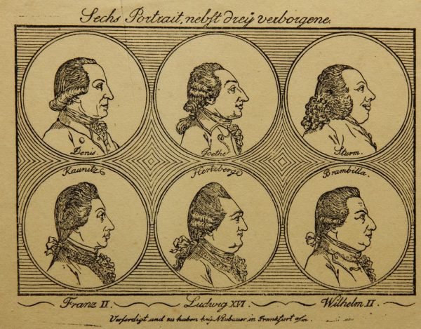 - Beschreibung: Am Rand der Darstellung in Druckstock bezeichnet mit “Sechs Portrait nebst drey verborgene”. Darstellung zeigt Porträts vonDenis Diderot (1713 Langres – 1784 Paris, Schriftsteller und Philosoph), Johann Wolfgang von Goethe (1749 Frankfurt am Main – 1832 Weimar, Dichter), Johann Christoph Sturm (1635 Hilpolstein – 1703 Altdorf, Astronom und Philosoph),Aloys von Kaunitz-Rietberg[?] (1774 Wien – 1848 Paris, Diplomat),Hertzberger und Giovanni Alessandro Brambilla[?] (1728 San Zenone al Po – 1800 Padua, Arzt). verborgen seien die Darstellungen Franz II. (1768 Florenz – 1835 Wien, Kaiser des Heiligen Römischen Reiches), Ludwig XVI. (1754 Versailles – 1793 Paris, König von Frankreich) und Wilhelm II. von Oranien Nassau [?] (1792 Den Haag – 1849 Tilburg, König der Niederlande).