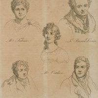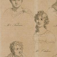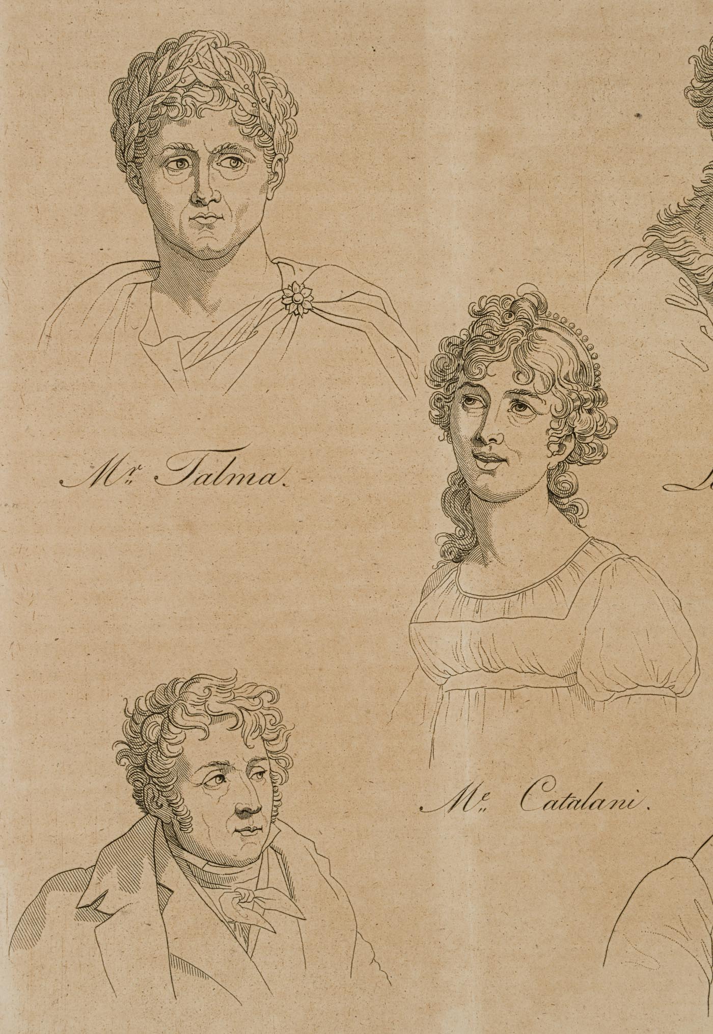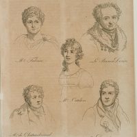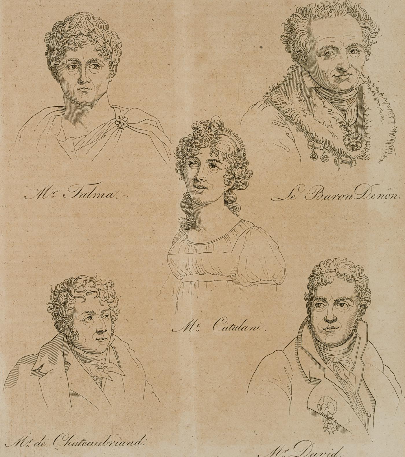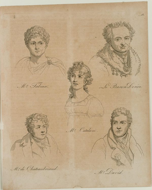 Three-quarter portraits of French actors in bust. Among them the actor Francois-Joseph Talma (1763-1826) and the young actress Madame Talani. Next to them a portrait of the literary figure and co-founder of French Romanticism Francois-Réne Chateaubriand (1768-1848).