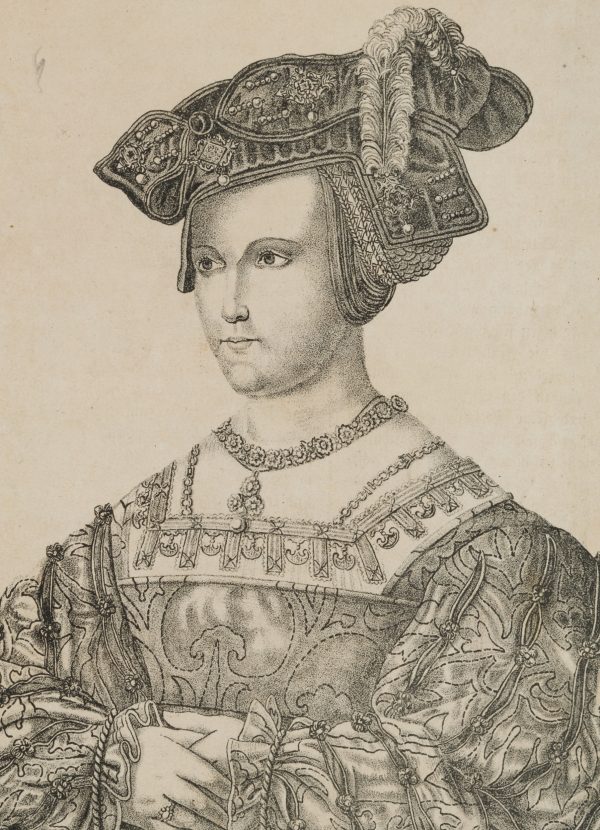 Unknown (19th century), Portrait of Anne Boleyn Bust in three-quarter profile to the left Preciously dressed, 19th century, Lithography