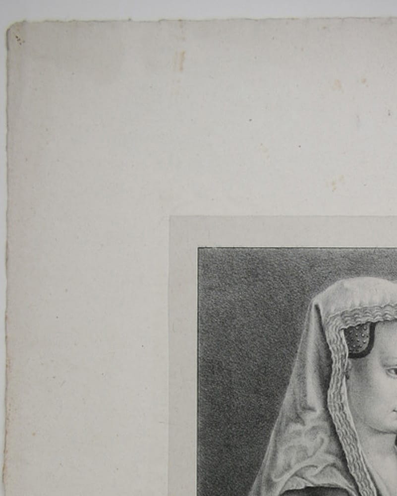 - Beschreibung: Lithographie eines anonymen Künstlers, bezeichnet im Stein unten: “Dame Bone Dartois duchesse de Borgougne”, darunter eine unleserliche Signatur. Sehr schönes Porträt der jungen Gräfing mit weißem Schleier. Die Gräfin Bonne d`Artois (1396 – 1425) war Tochter von Philippe d`Artois und damit Erbin von Nevers, Auxerres, Mâcon, Vermandois, Amiens, Ponthieu, Eu und Boulogne.
