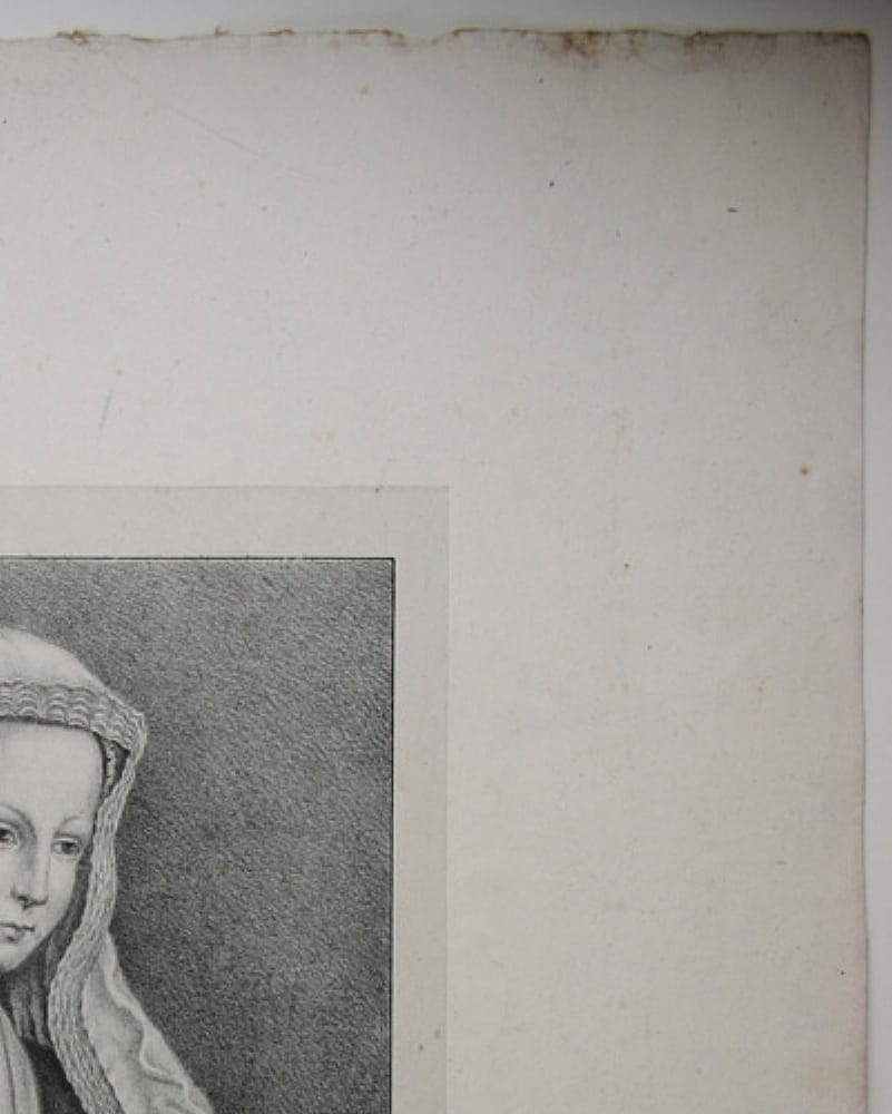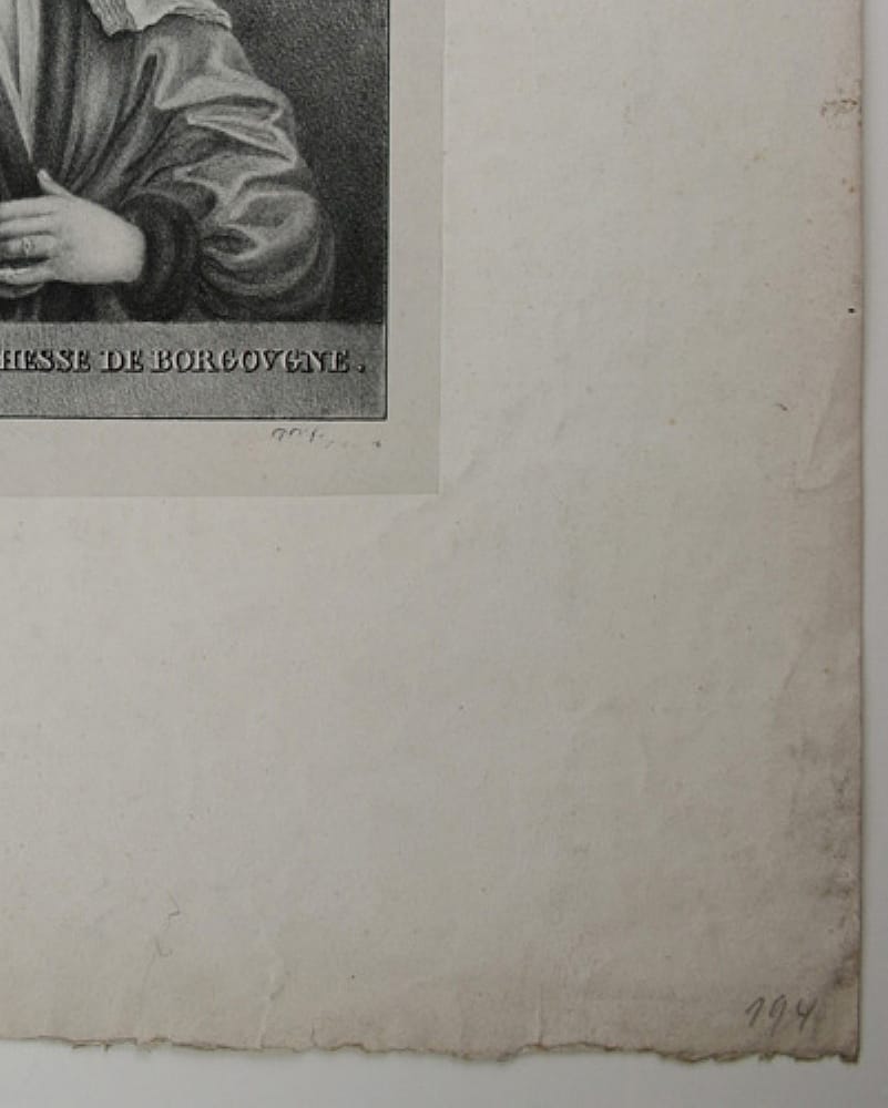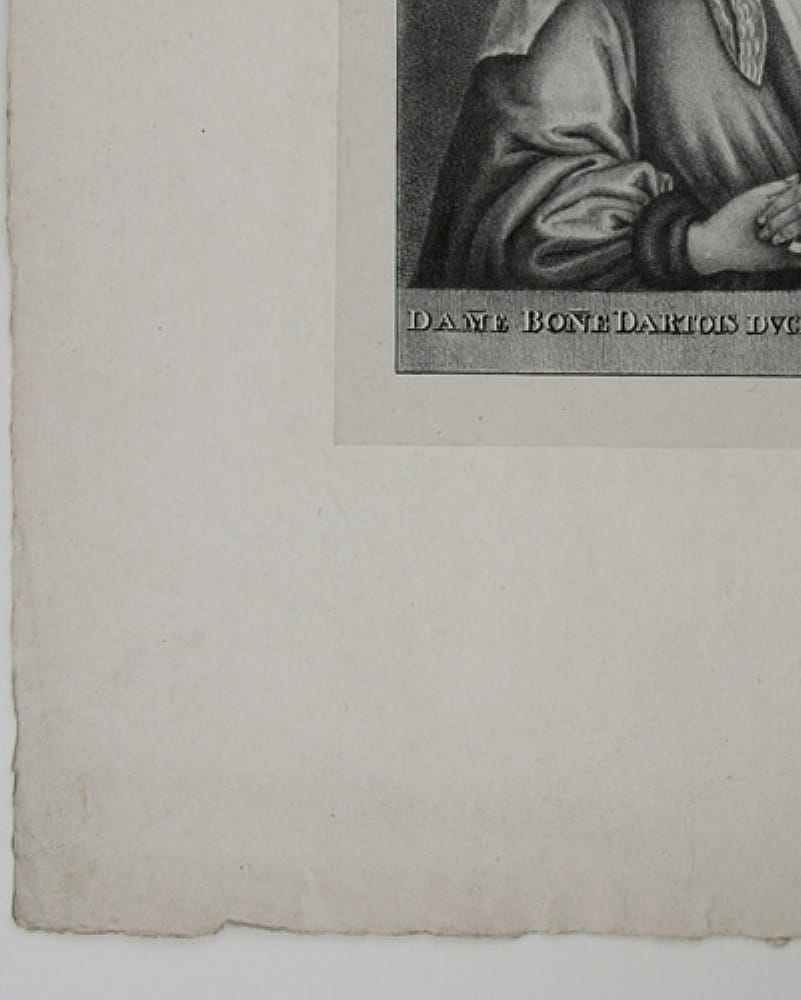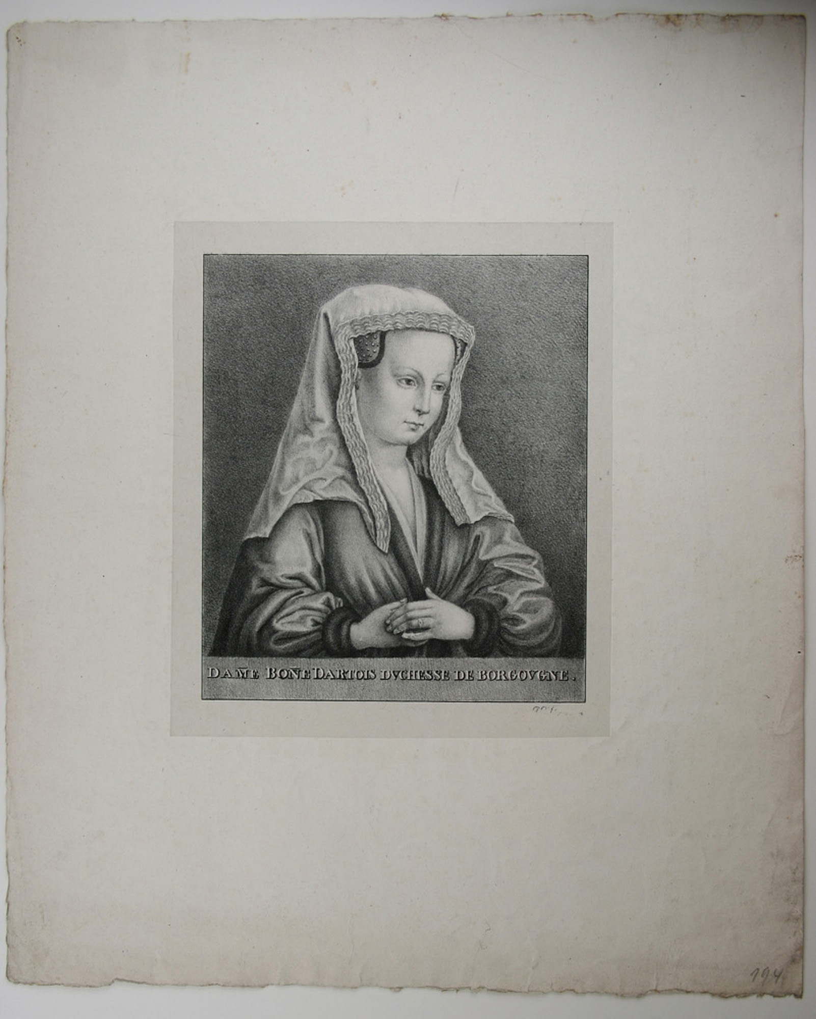 - Description: Lithograph by an anonymous artist, inscribed in the stone below: “Dame Bone Dartois duchesse de Borgougne”, below an illegible signature. Very fine portrait of the young Countess with white veil. The Countess Bonne d`Artois (1396 – 1425) was daughter of Philippe d`Artois and thus heiress of Nevers, Auxerres, Mcon, Vermandois, Amiens, Ponthieu, Eu and Boulogne.