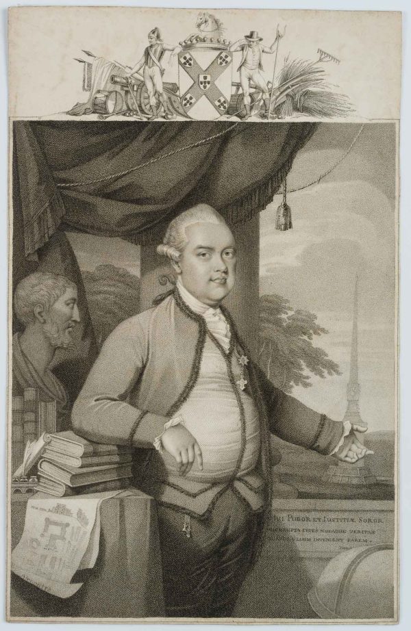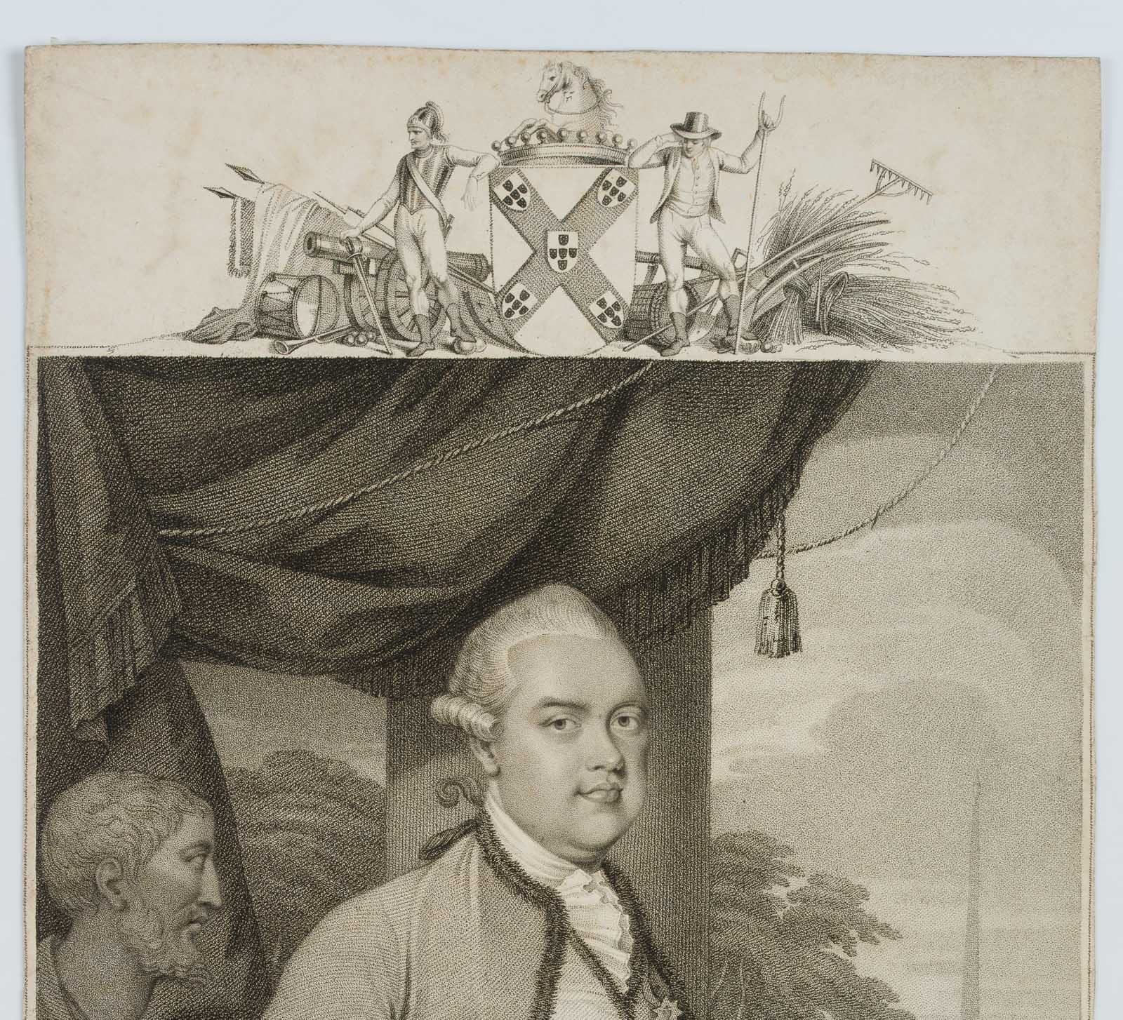 - Beschreibung: Oberhalb des Portraits mit Wappen, Pferdekop, Soldaten und Kornbündel.