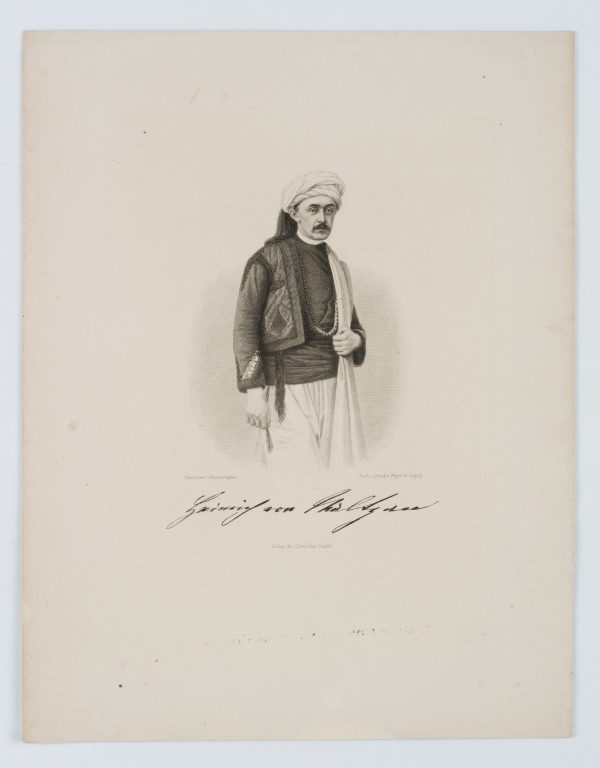 Unbekannt (19. Jahrhundert), Portrait eines Mannes mit Turban und orientalischer Gewandung. Kniestück, um 1850, Stahlstich