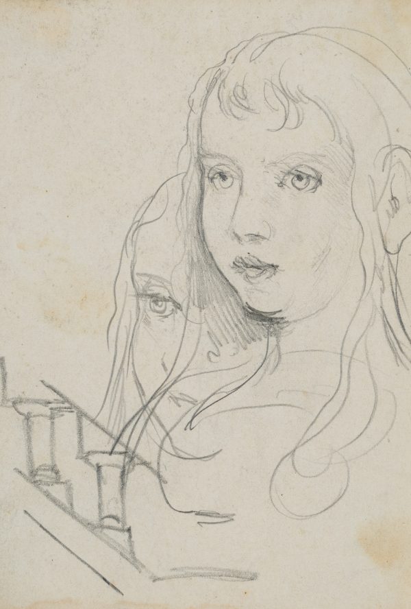 - Description: Viewing side with the sketch of two girls’ heads and the fragment of a banister.