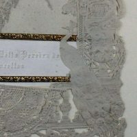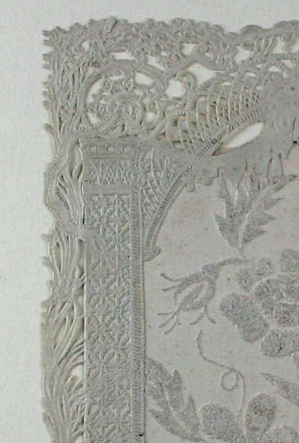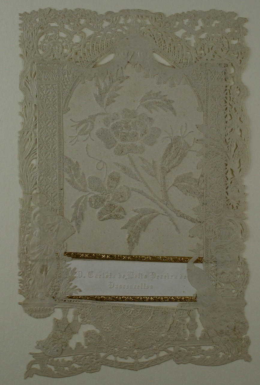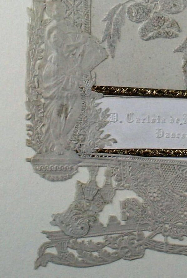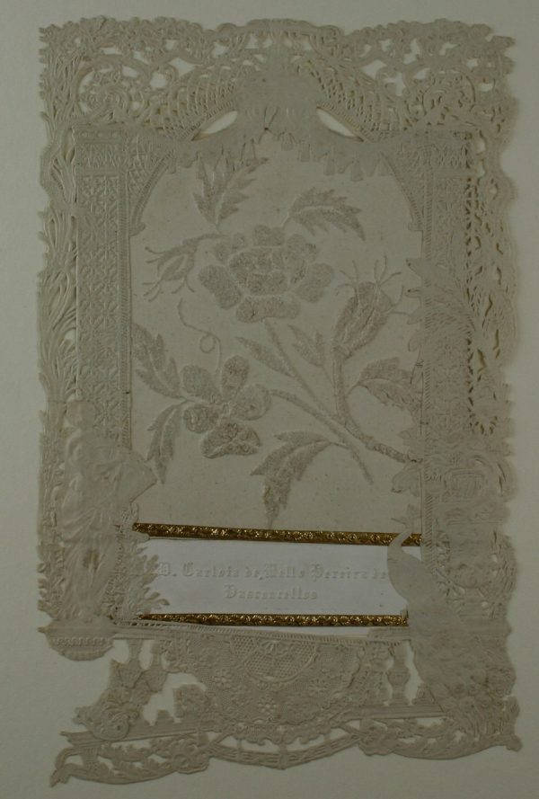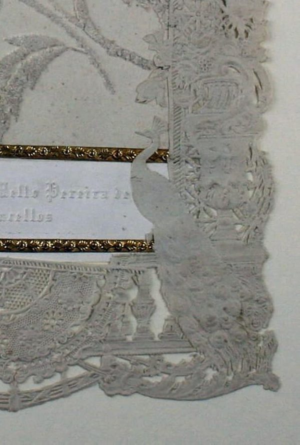 - Description: Paper relief, below an inscription framed with brass strips: “D. Carlota de Mello Pereira de Vasconcellos”. Very ornate handmade paper relief of a rose with brass framed name. Finest paper lace with peacock and nymph frame the paper relief.