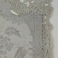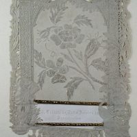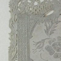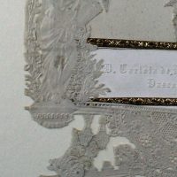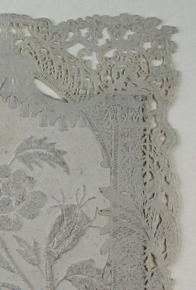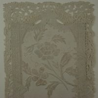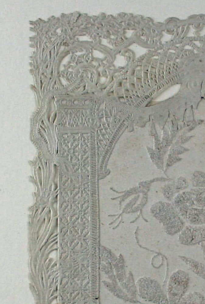 - Beschreibung: Papierrelief, darunter eine mit Messingleisten gerahmte Bezeichnung: “D. Carlota de Mello Pereira de Vasconcellos”. Sehr kunstvolles, handgefertigtes Papierrelief einer Rose mit messinggerahmtem Namenszug. Feinste Papierspitze mit Pfau und Nymphe rahmen das Papierrelief.