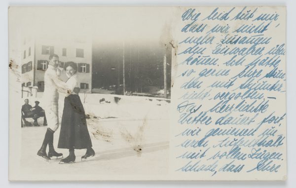 Unbekannt (19. Jahrhundert), Postkarte mit schlittschuhlaufendem Paar, um 1900, Schwarzweißfotografie