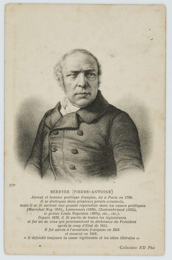 Unknown (19th century), Postcard with portrait of the French politician Pierre-Antoine Berryer (*1790-1868), 19th century, Lithography
