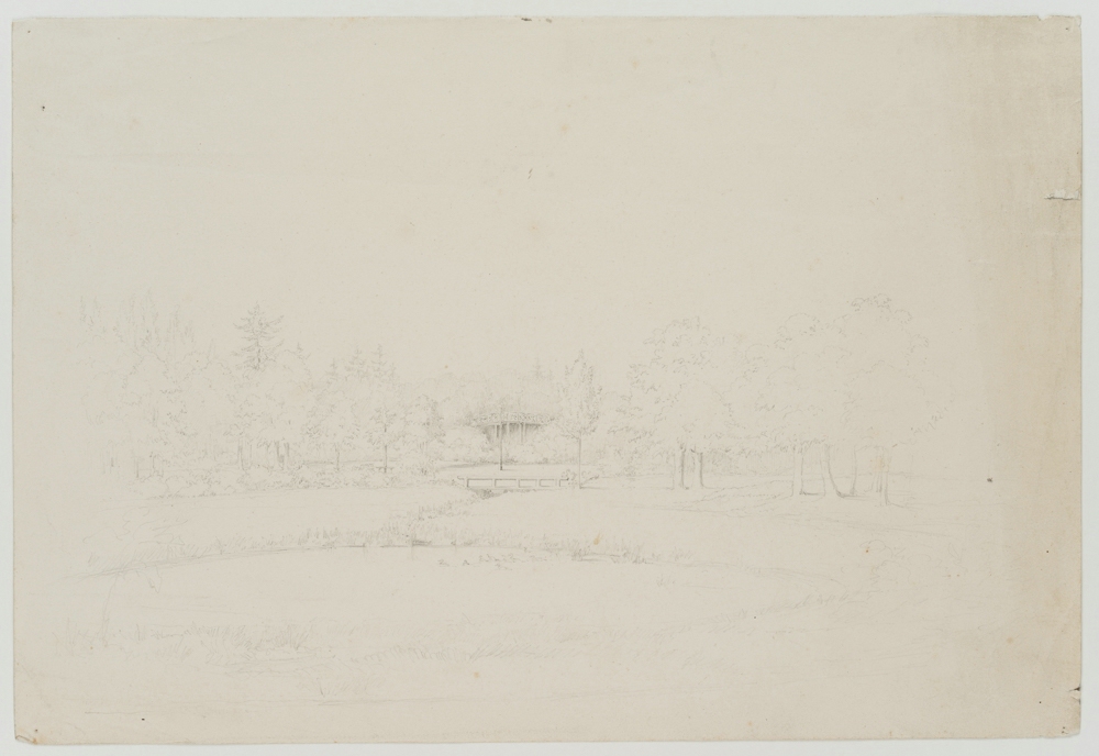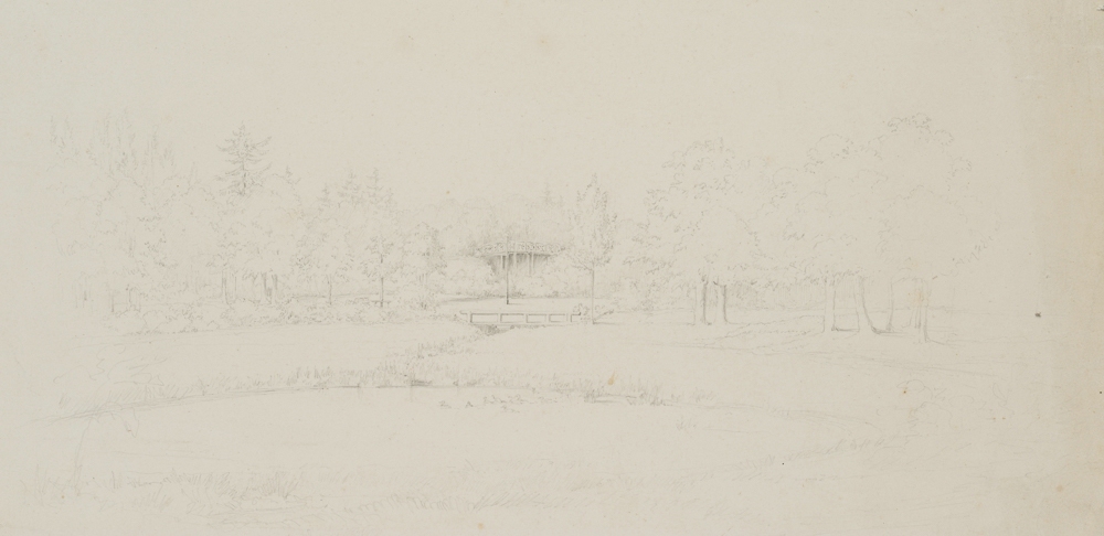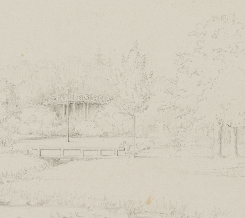Unknown (19th century), Potsdam Landscape Park, duck pond with bridge, c. 1830, Pencil