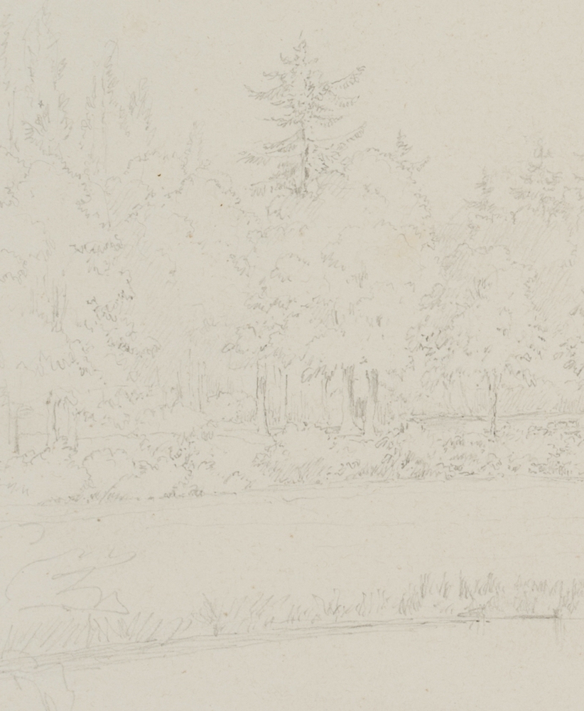 Unbekannt (19. Jahrhundert), Potsdamer Landschaftspark, Ententeich mit Brücke, um 1830, Bleistift