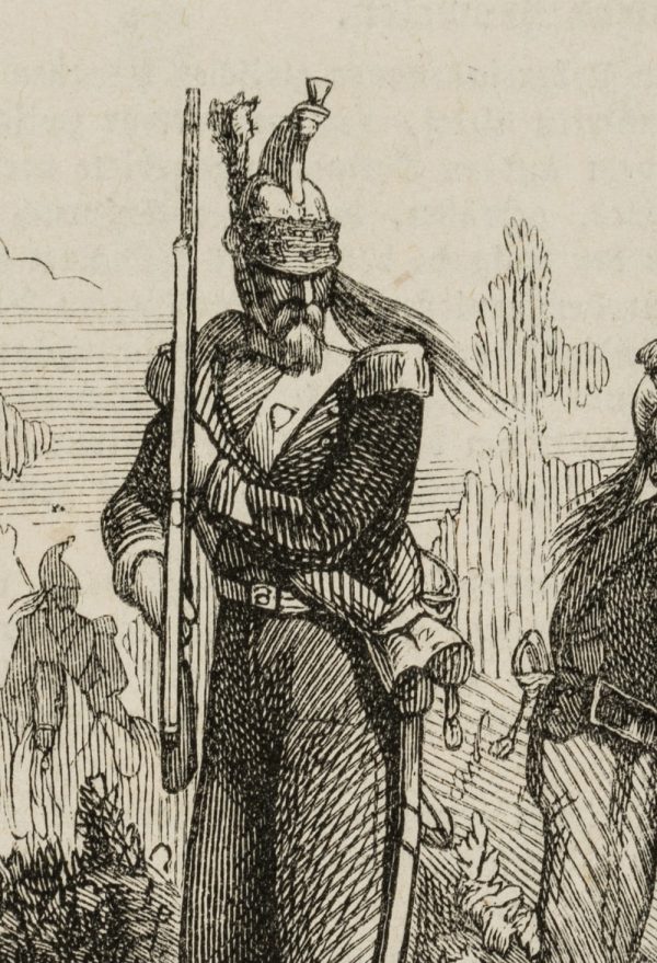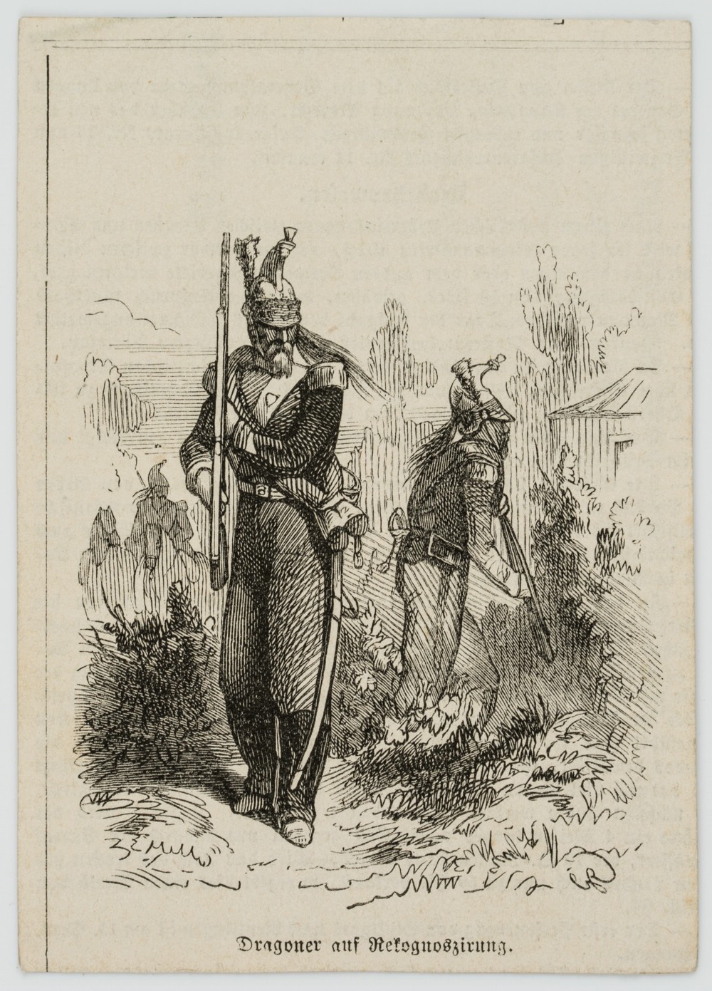 Unbekannt (19. Jahrhundert), Preußische Dragoner bei Aufklärung zu Fuß, 19. Jahrhundert, Holzstich