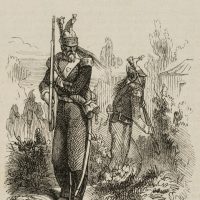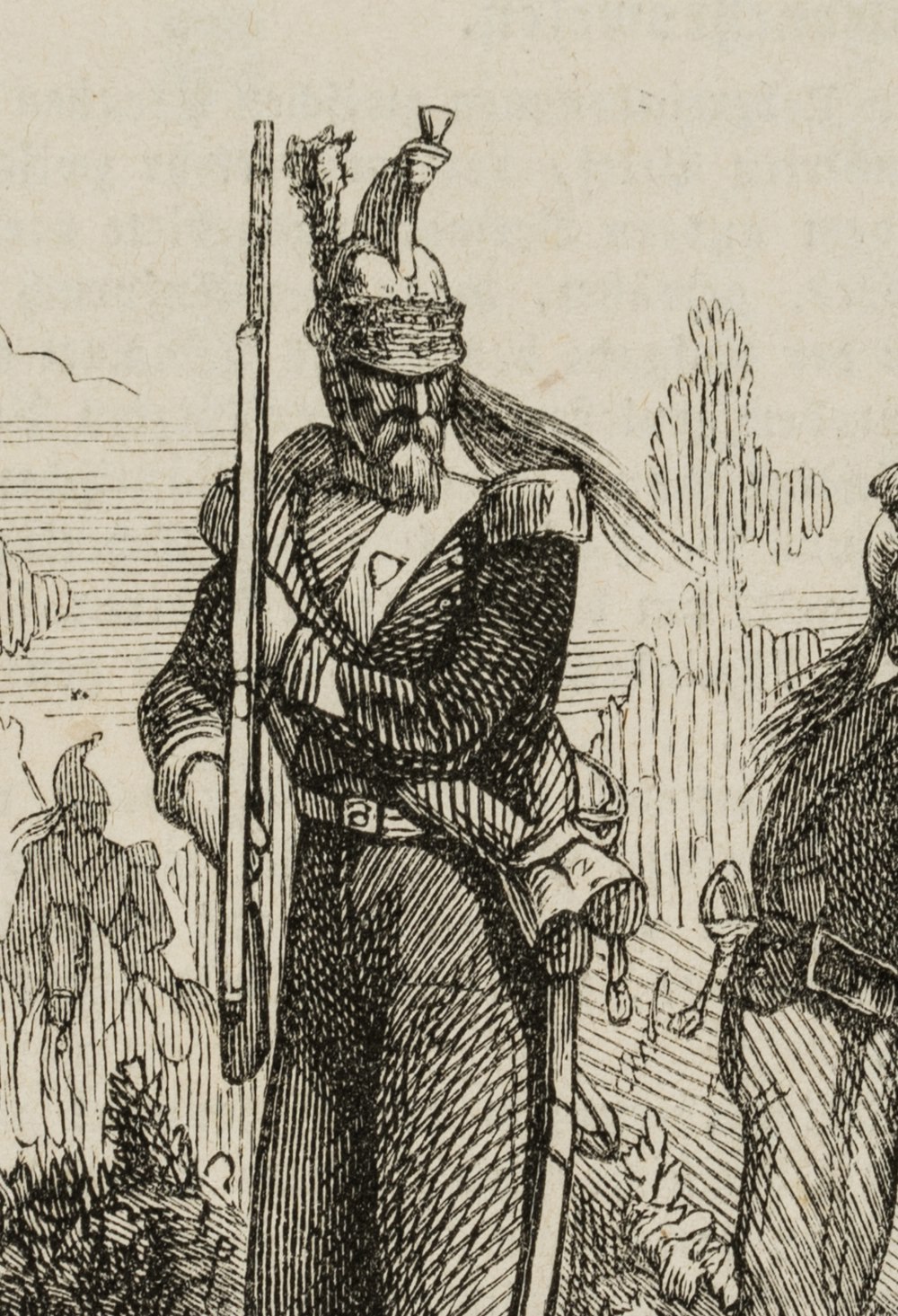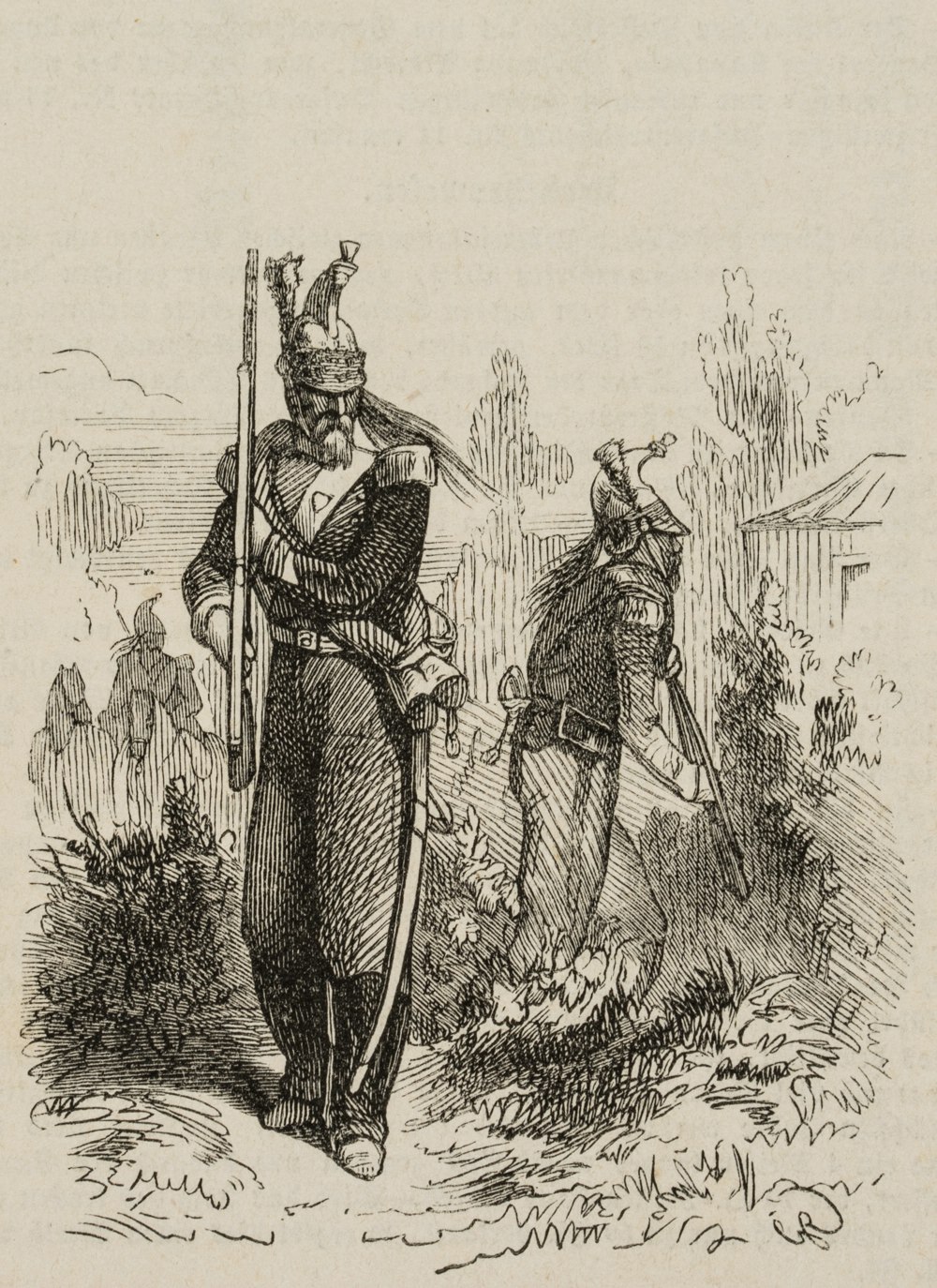 Unknown (19th century), Prussian dragoons on reconnaissance on foot, 19th century, Wood engraving