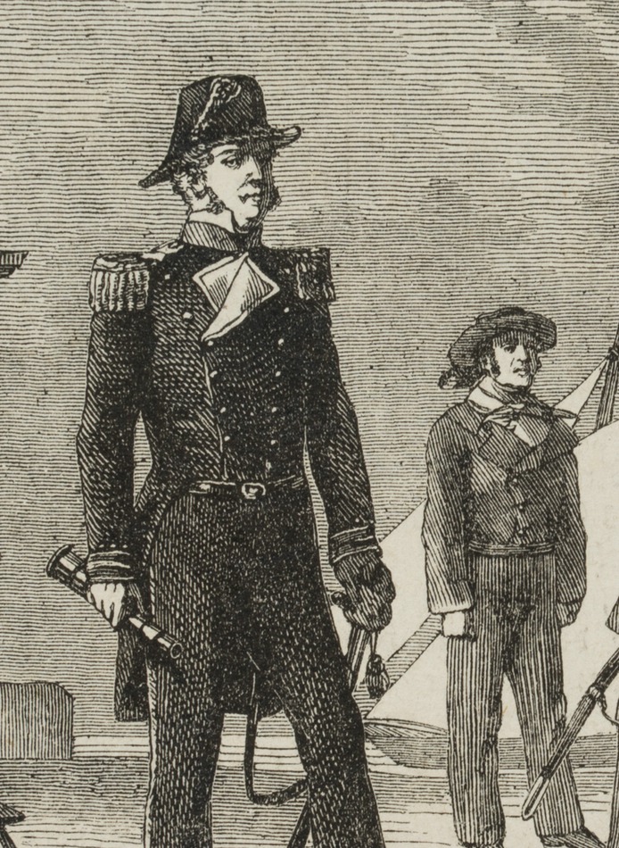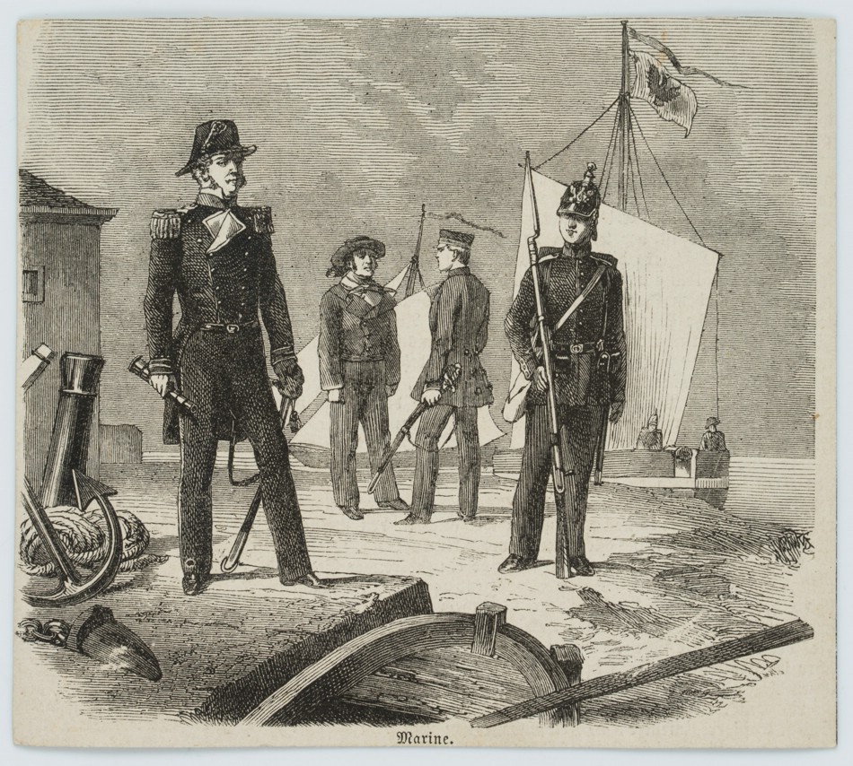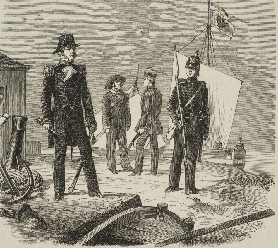 Unknown (19th century), Prussian marines with captain in the harbour, 19th century, Wood engraving