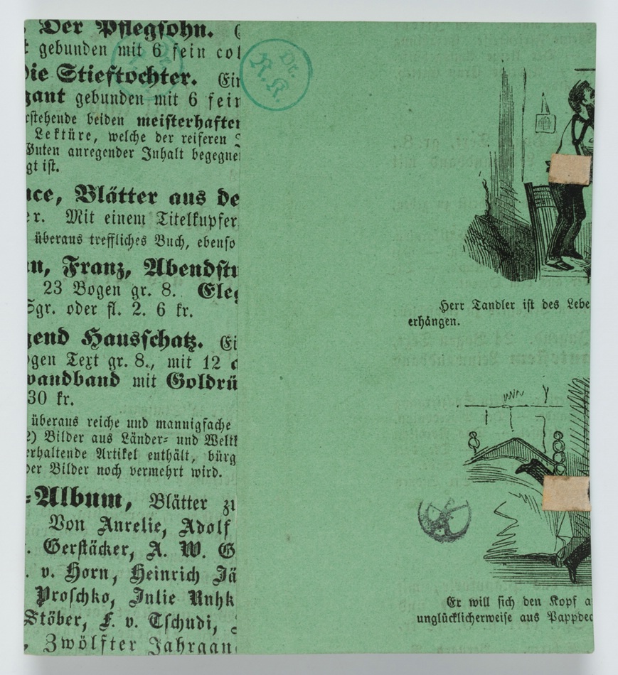 - Beschreibung: Verso befindet sich mit Bild- und Textfragmenten bedrucktes, grünes Papier sowie die Sammlungsstempel “Dr. R.K.” (Lugt-Nr. 4641) und “EK” (Lugt Nr. 3549).