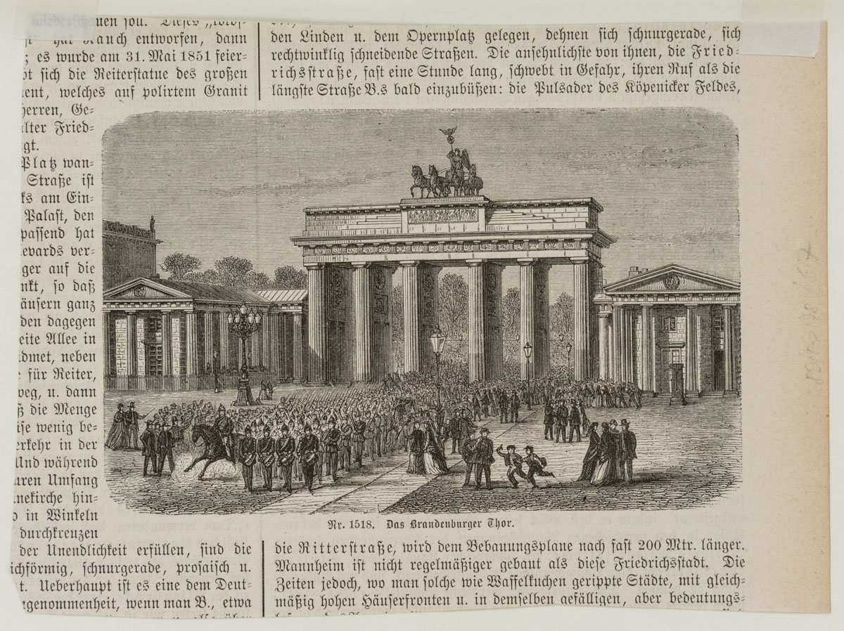 - Description: View of the Brandenburg Gate in Berlin seen from Pariser Platz. Illustration of an old magazine or newspaper with typographic print all around and on the reverse.