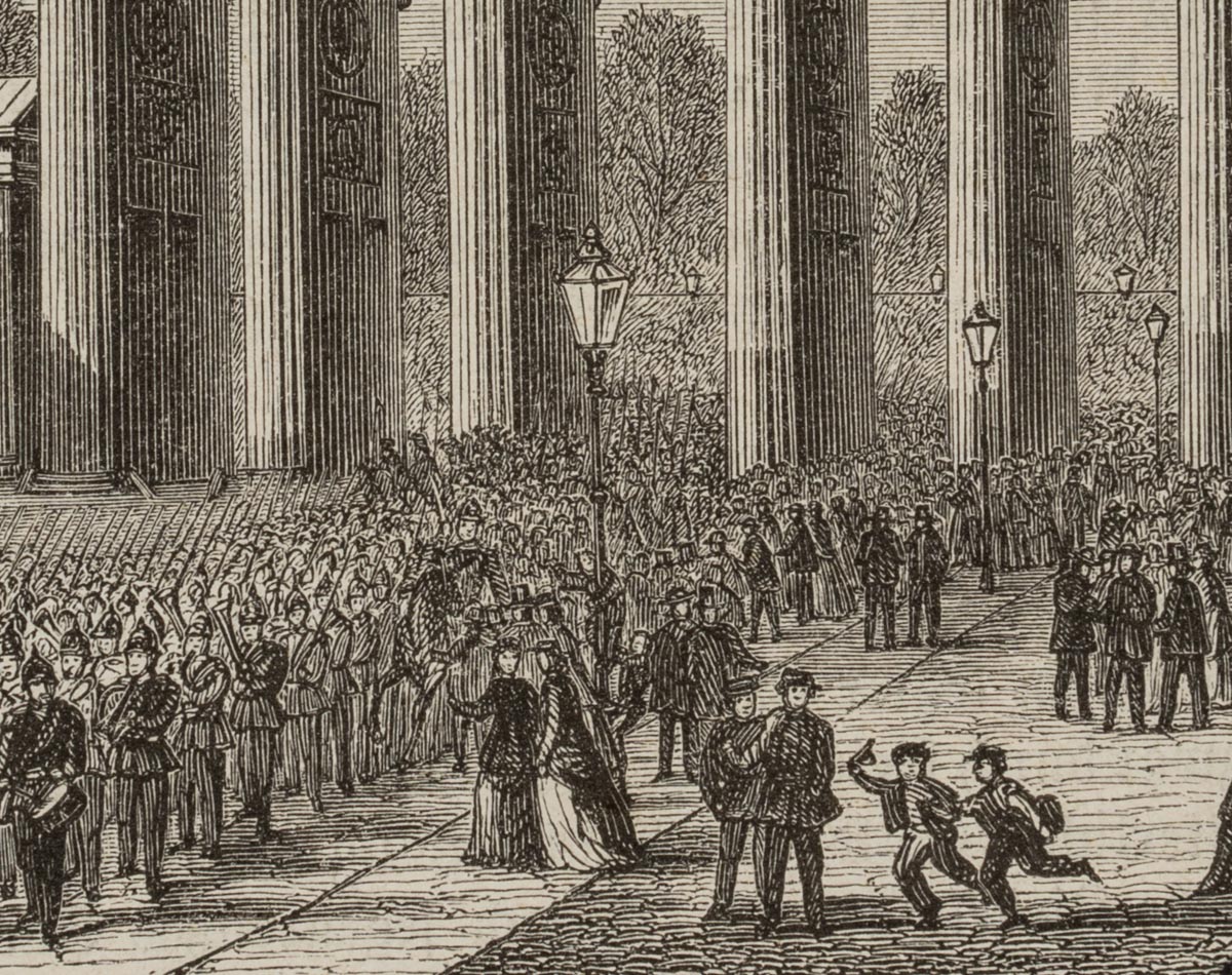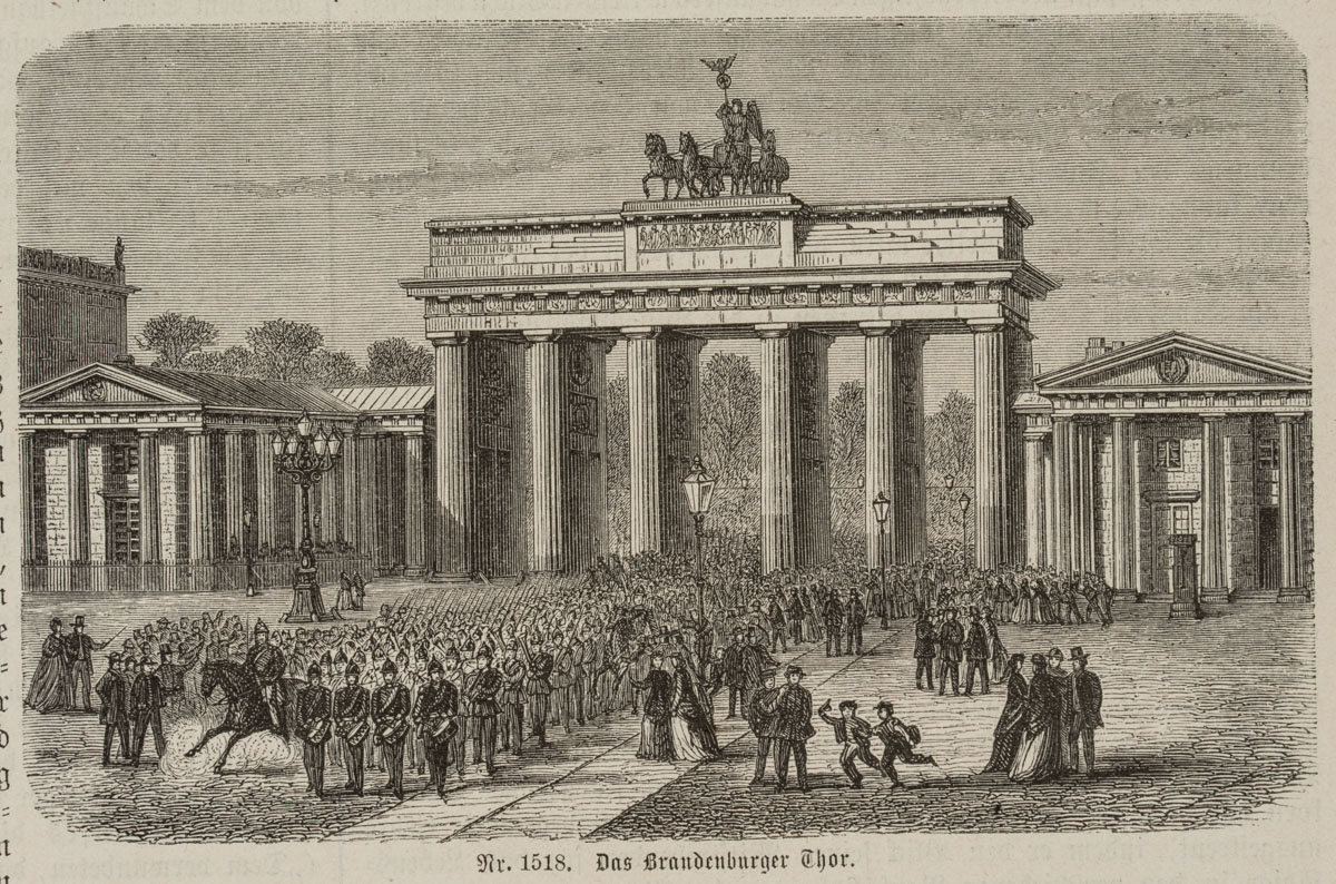 Unknown (19th century), Prussian soldiers march through the Brandenburg Gate in Berlin, c. 1880, Wood engraving