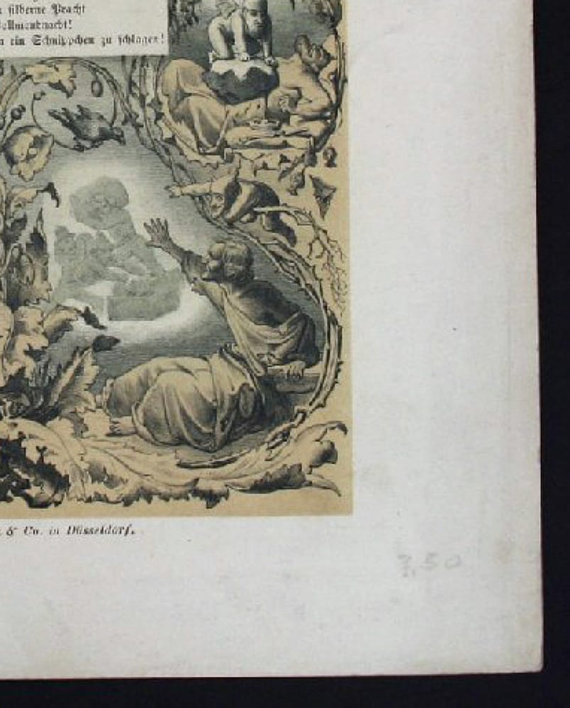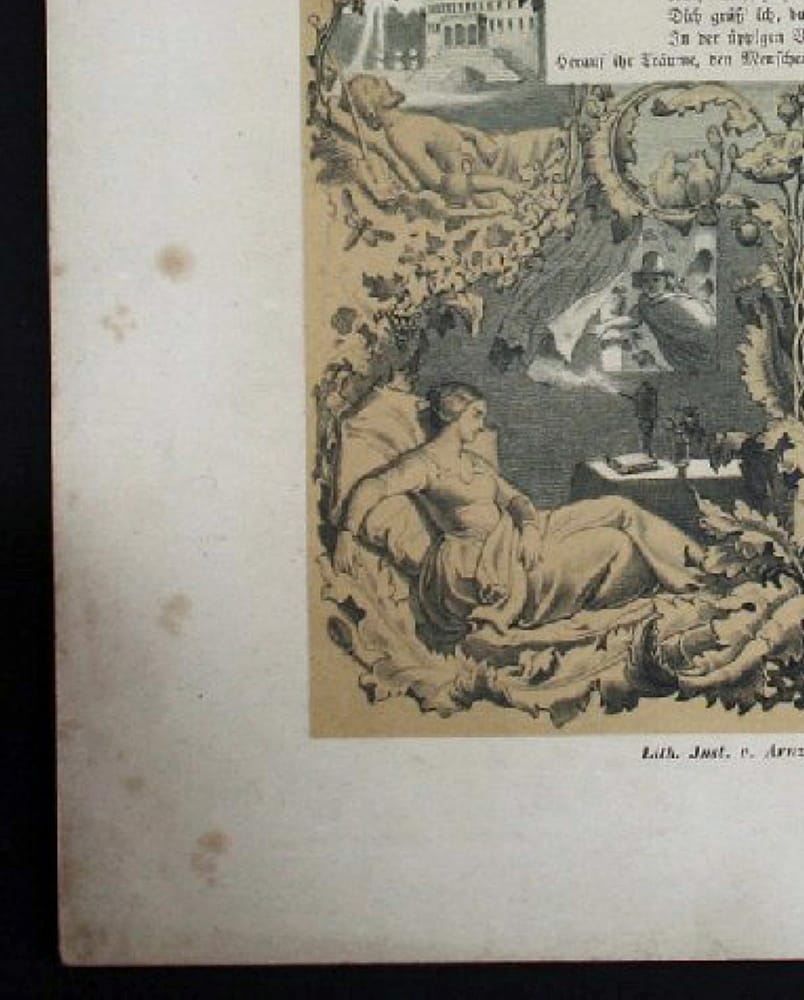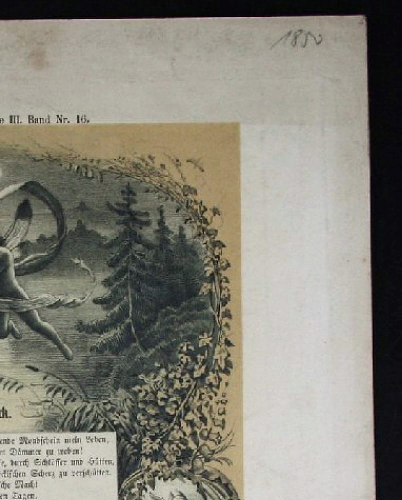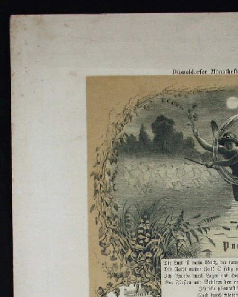 - Beschreibung: Farblithografie eines unbekannten Künstlers, bezeichnet oben: “Düsseldorfer Monatshefte III. Band Nr. 16”, unten: “Lith. Just. v. Arnz & Co. in Düsseldorf”, im Bild: “Puck Die Luft ist mein Reich, der tanzende Monschein mein Leben.”. Blattwerk und Ranken rahmen fünf unterschiedlichen Szenen voneinander. Im oberen Teil des Blattes fliegt Puck mit der Blume in der Hand durch die Nacht. Die “Düsseldorfer Monatshefte” nannte sich eine deutsche Satirezeitschrift, die in den Jahren 1847 bis 1861 erschien.