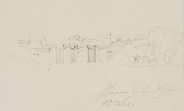 Unbekannt (19. Jahrhundert), Zeichnung aus einem Reiseskizzenbuch, Landschaft mit Brücke, um 1850, Bleistift