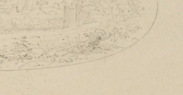 • Beschreibung: Miniaturisierte Landschaft mit einem reitenden Gentleman mit zwei Pferden nahe einer kleinen Ortschaft.