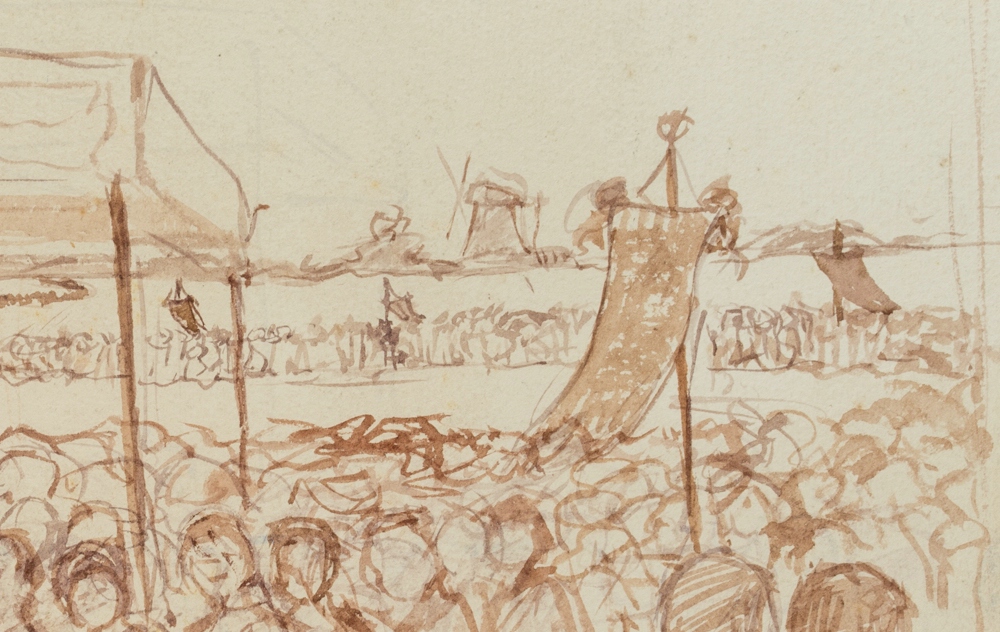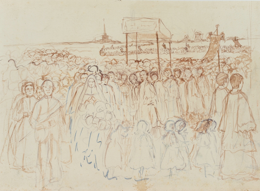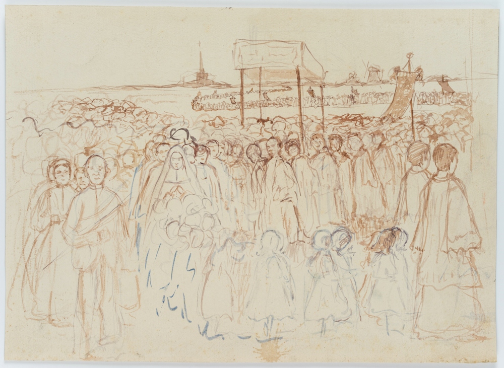 • Description: Sketchy depiction of a Corpus Christi procession in a flat, northern German or Dutch landscape. In the foreground, altar servers and communion children walk in front of a nun and other clergy with a carrying tent. In the distance a high church tower and a windmill can be seen.