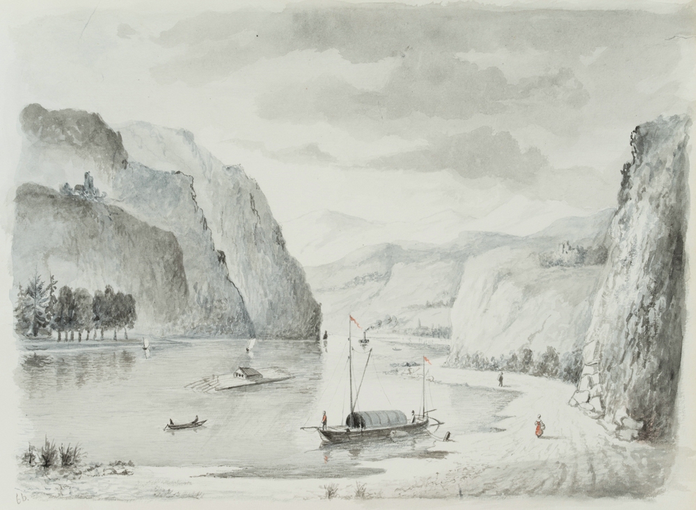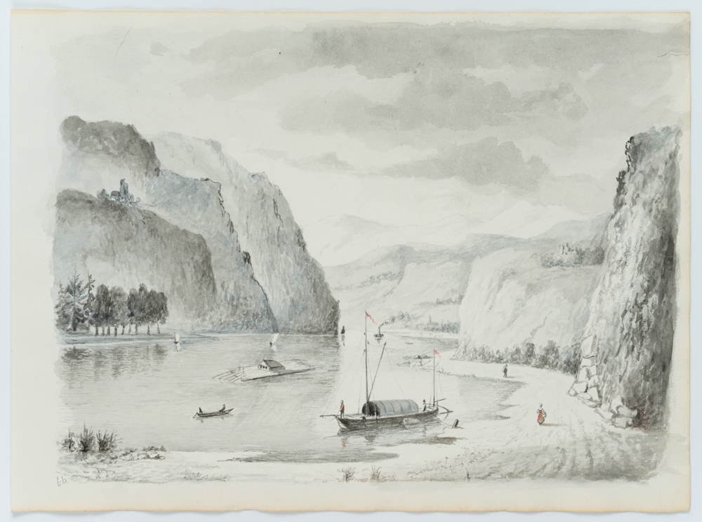 Unknown (19th century), Romantic river valley with rafters, Rhine region, 19th century, Watercolor