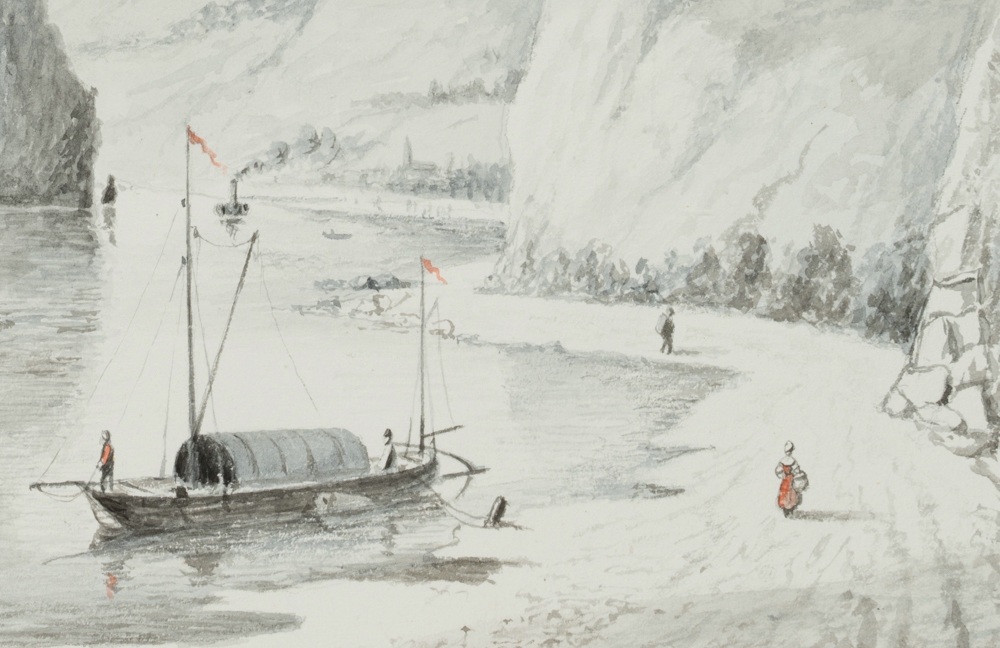 - Beschreibung: Schönes Landschaftsbild mit Blick über einen breiten Strom, der sich durch ein steiles Tal schlängelt. Die Darstellung besticht durch ihre reduzierte Farbigkeit in Grautönen mit einzelnen roten Akzenten. Das Werk stammt aus dem Skizzenbuch eines unbekannten französischen Künstlers, der Mitte des 19. Jahrhunderts in den Niederlanden, Belgien, Norddeutschland und der Rheingegend unterwegs war und insbesondere holländische, flämische und norddeutsche Landschaften festgehalten hat. Dabei zeigt er den Alltag der Bewohner an den großen und kleinen Flüssen sowie Einblicke in Stadtlandschaften der Nordsee-Region.
