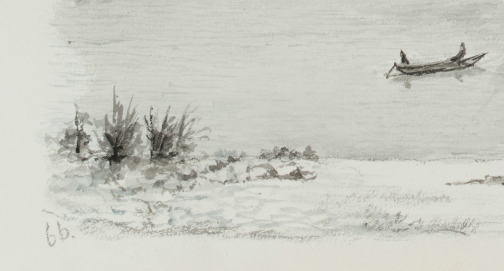 - Description: Beautiful landscape painting with a view over a wide stream winding through a steep valley. The depiction captivates by its reduced colourfulness in grey tones with single red accents. The work comes from the sketchbook of an unknown French artist who travelled in the Netherlands, Belgium, northern Germany and the Rhine region in the mid-19th century, capturing in particular Dutch, Flemish and northern German landscapes. In doing so, he shows the everyday life of the inhabitants along the large and small rivers as well as glimpses of cityscapes in the North Sea region.