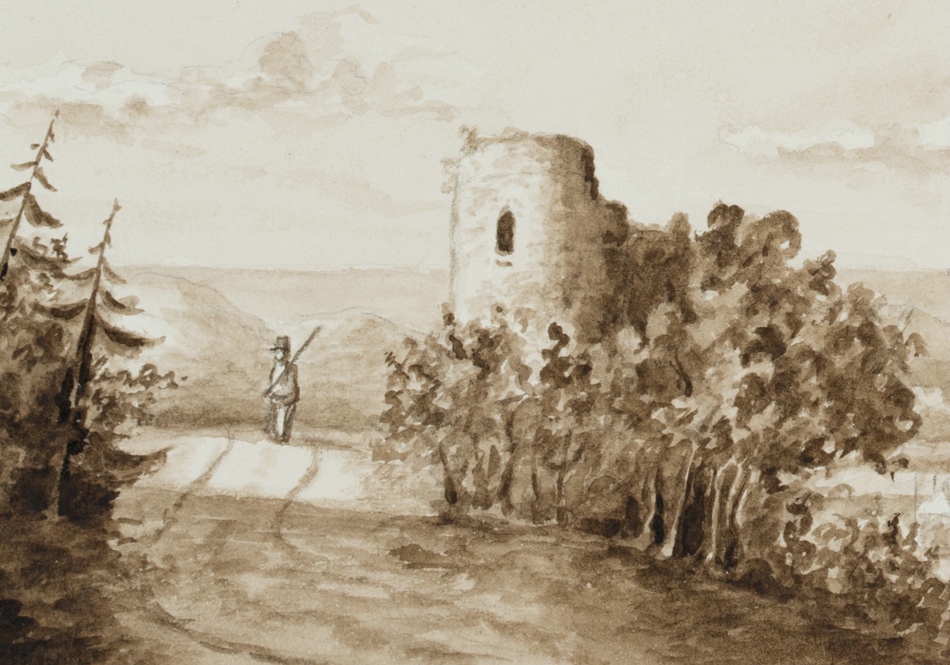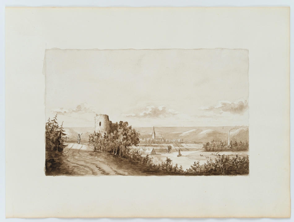 Unknown (19th century), Ruin and cultural landscape in the Rhine region, 19th century, Brush drawing