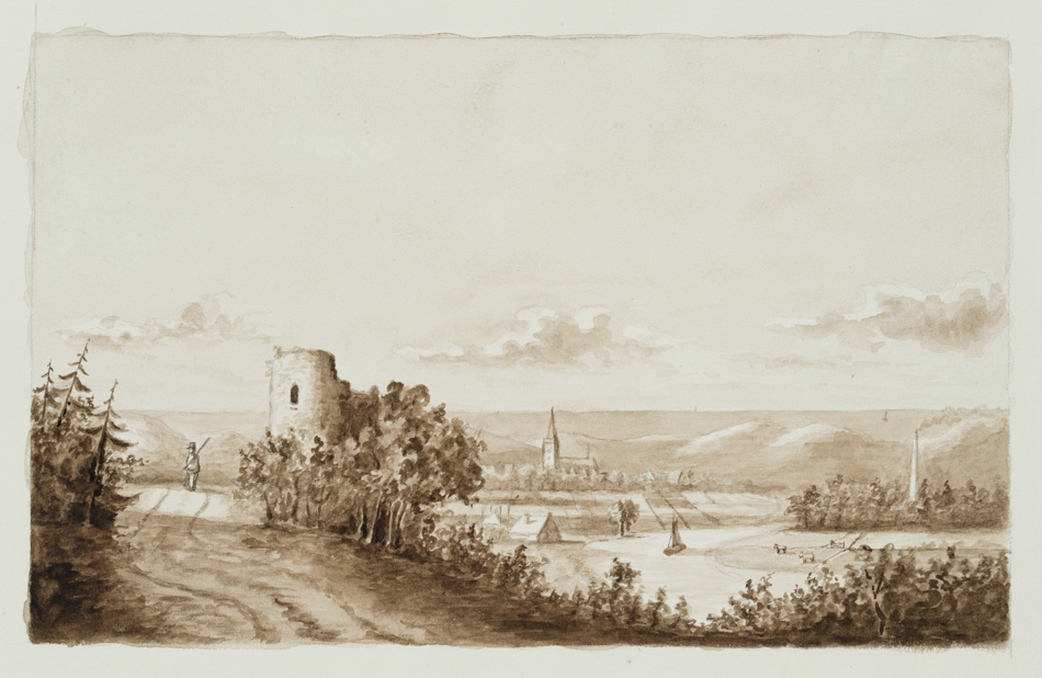 - Description: From the top of a road the artist looks down over a river valley. On the bank of the winding river a church can be seen in the middle of a small village. In the wooded area behind some pastures, a smoking industrial chimney stands out. In the foreground, the romantic motif of an overgrown ruined tower enlivens the picture.