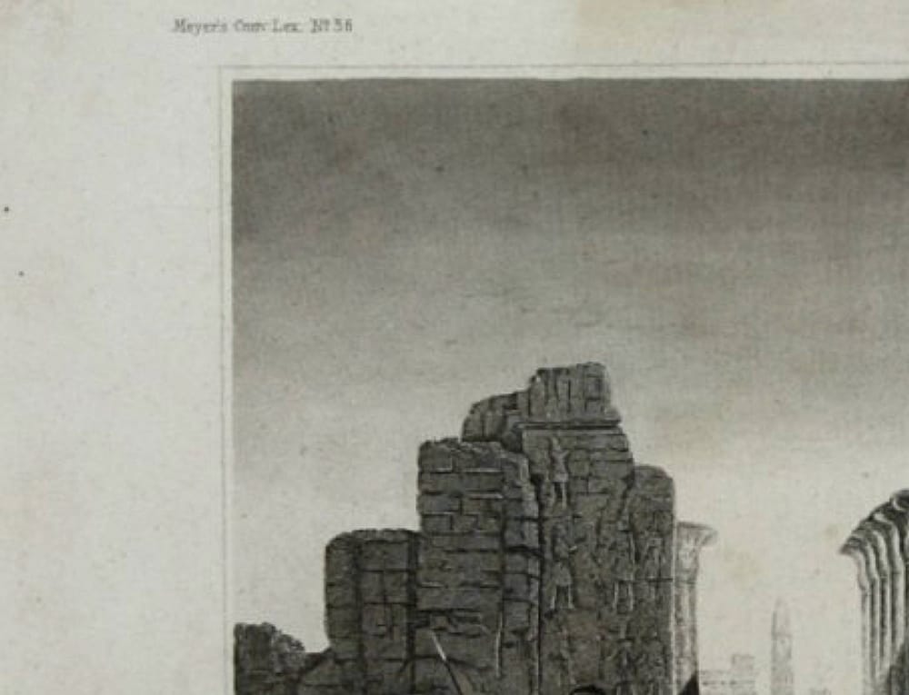 - Beschreibung: Stahlstich eines anonymen deutschen Künstlers, bezeichnet oben links: “Meyer`s Conv. Lex. N° 36”, unten: “Ruinen von Theben in Egypten Aus d. Kunstanstalt d. Bibliogr. Instituts in Hildbh. Eigenthum d. Verleger”. Beeindruckende Ansicht eines Ruinenfeldes mit monumentalten Säulen und ägyptischen Kriegern.