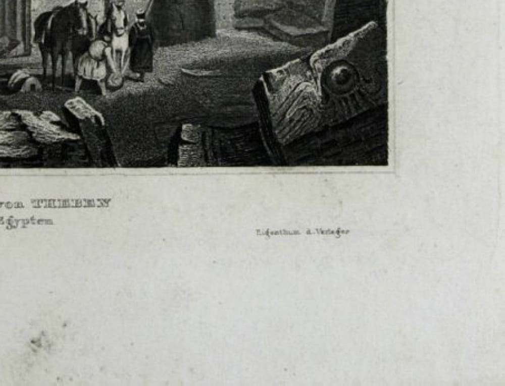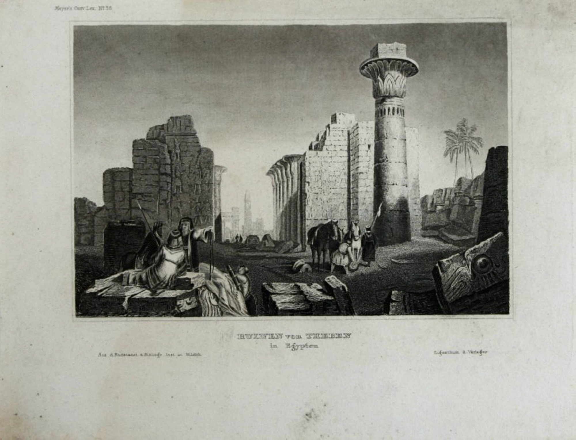 - Description: Steel engraving by an anonymous German artist, inscribed upper left: “Meyer`s Conv. Lex. N° 36”, below: “Ruinen von Theben in Egypten Aus d. Kunstanstalt d. Bibliogr. Institute in Hildbh. Property of the publisher”. Impressive view of a field of ruins with monumental columns and Egyptian warriors.