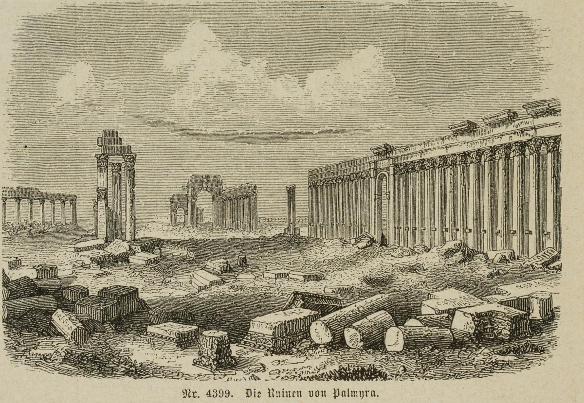- Description: Named „No. 4399. The Ruins of Palmyra“. View of the ruins of the former oasis city of Palmyra, in present-day Syria. By the third century, the city was a prosperous metropolis and had risen to become a regional centre of the Middle East. The Palmyrians were among the renowned merchants, established stations along the Silk Road and traded throughout the empire. The ruins of the once imposing buildings of the oasis city still bear witness to this time.
