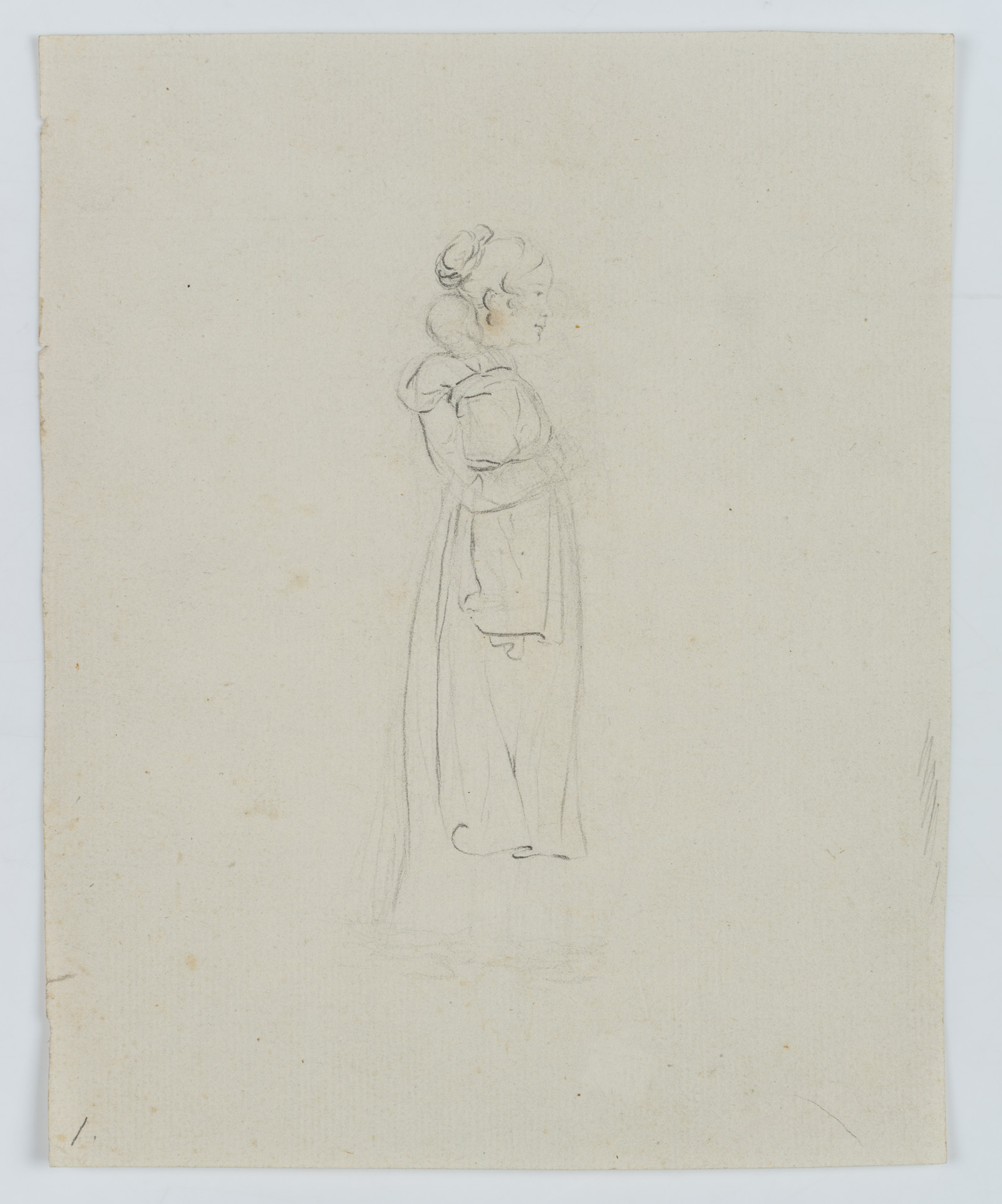 - Beschreibung: Gefühlvolle Skizze einer Mutter mit ihrem Säugling oder Kleinkind. Einfache Tracht und eine Schürze tragend, sowie eine schlichte, verspielte Frisur zeigt die Zeichnung eine junge Mutter oder eine Kinderfrau. Der Säugling klammert sich an ihren Arm und ist ihr vertraut zugeneigt.