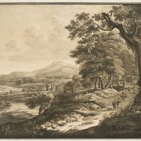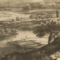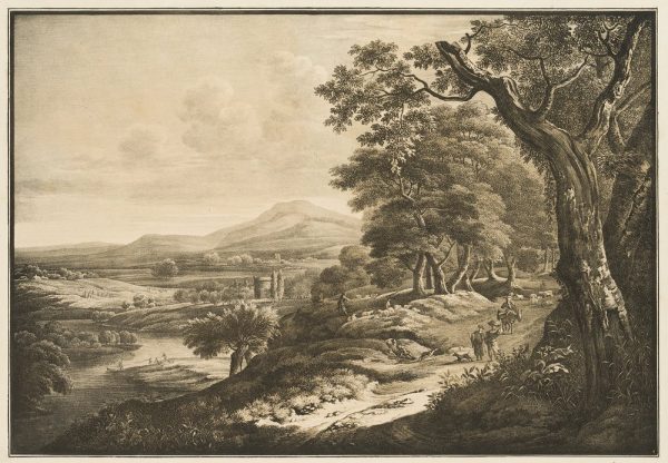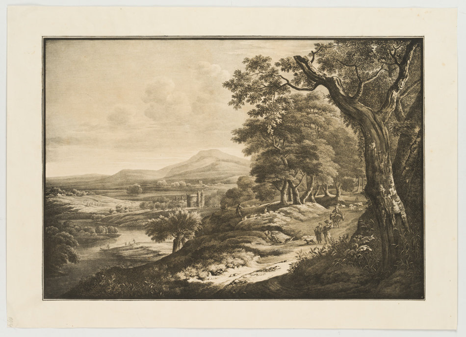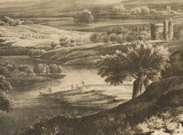 - Beschreibung: Am Rande eines Waldes öffnet sich ein ausgetretener Weg in den Vordergrund des Bildes. Seitlich des viel beschrittenen Weges befinden sich einige Schafhirten mit ihrer Herde, von der sich einige Tiere entfernt haben und im Schatten der Bäume grasen. Wo die Kronen der Bäume enden, öffnet sich der weite Blick in eine sanft geschwungene Hügellandschaft, die links von einem Fluss durchflossen wird. Inmitten einer kleinen Baumgruppe steht die Ruine eines runden Steinturmes, die dem Grabmal der Cecilia Metella an der Via Appia nahe Rom ähnelt. Die weitschweifende Wirkung der großformatigen Lithographie wird vor allem durch die geschickt gesetzte Staffelung aus Vorder-, Mittel- und Hintergrund erreicht. Auf der Unterlage befindet sich ein Ausschnitt aus einem Lage- oder Katasterplan.