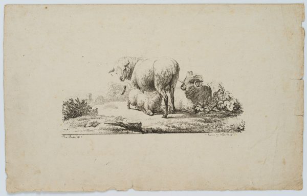 Unbekannt (19. Jahrhundert), Schafsfamilie auf der Wiese mit säugendem Lamm in der Ferne ein Turm, 1805, Lithographie