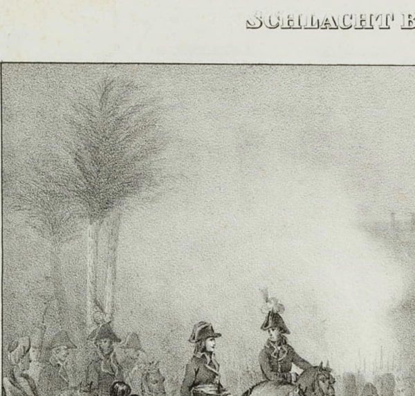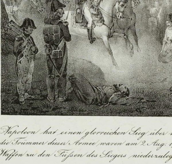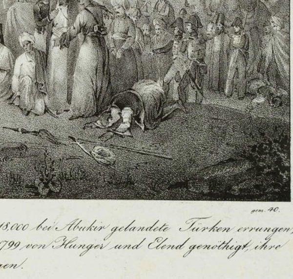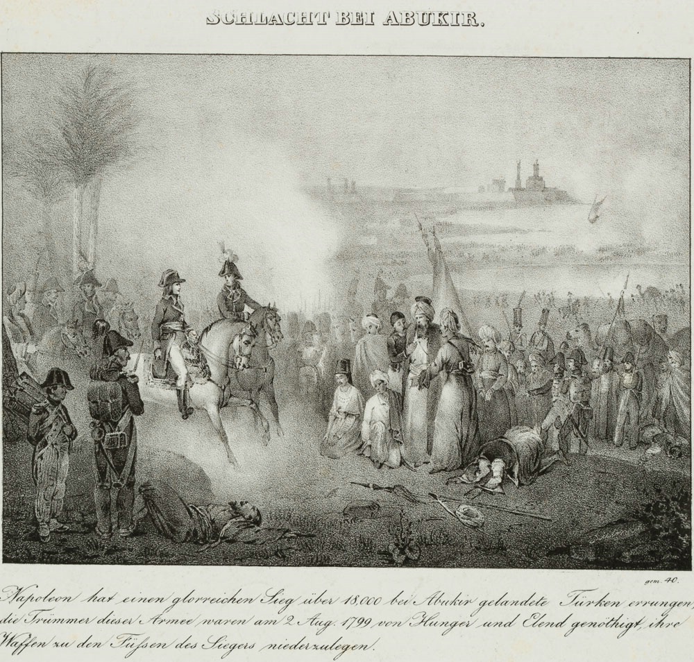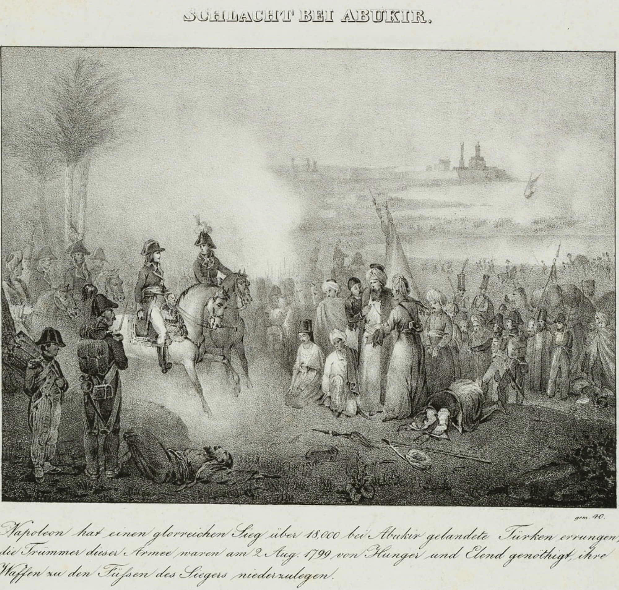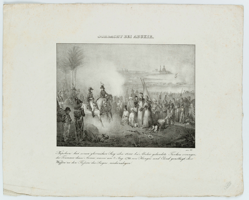 Unbekannt (19. Jahrhundert), Historiendarstellung von der Schlacht bei Abukir mit Napoleon auf dem Pferd inmitten seiner Truppen vor dem gefangenen Feind, 19. Jahrhundert, Lithographie