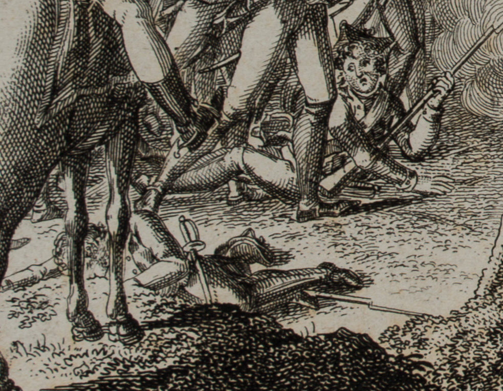 Unbekannt (19. Jahrhundert), Schlachtenszene mit kämpfenden & gefallenen preußischen Soldaten, Miniatur, Sammlung Hasselmann, 19. Jahrhundert, Radierung