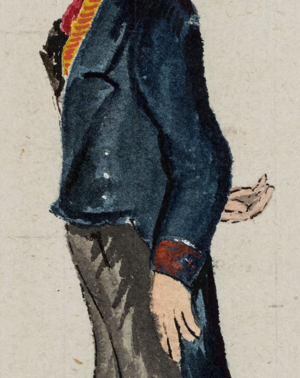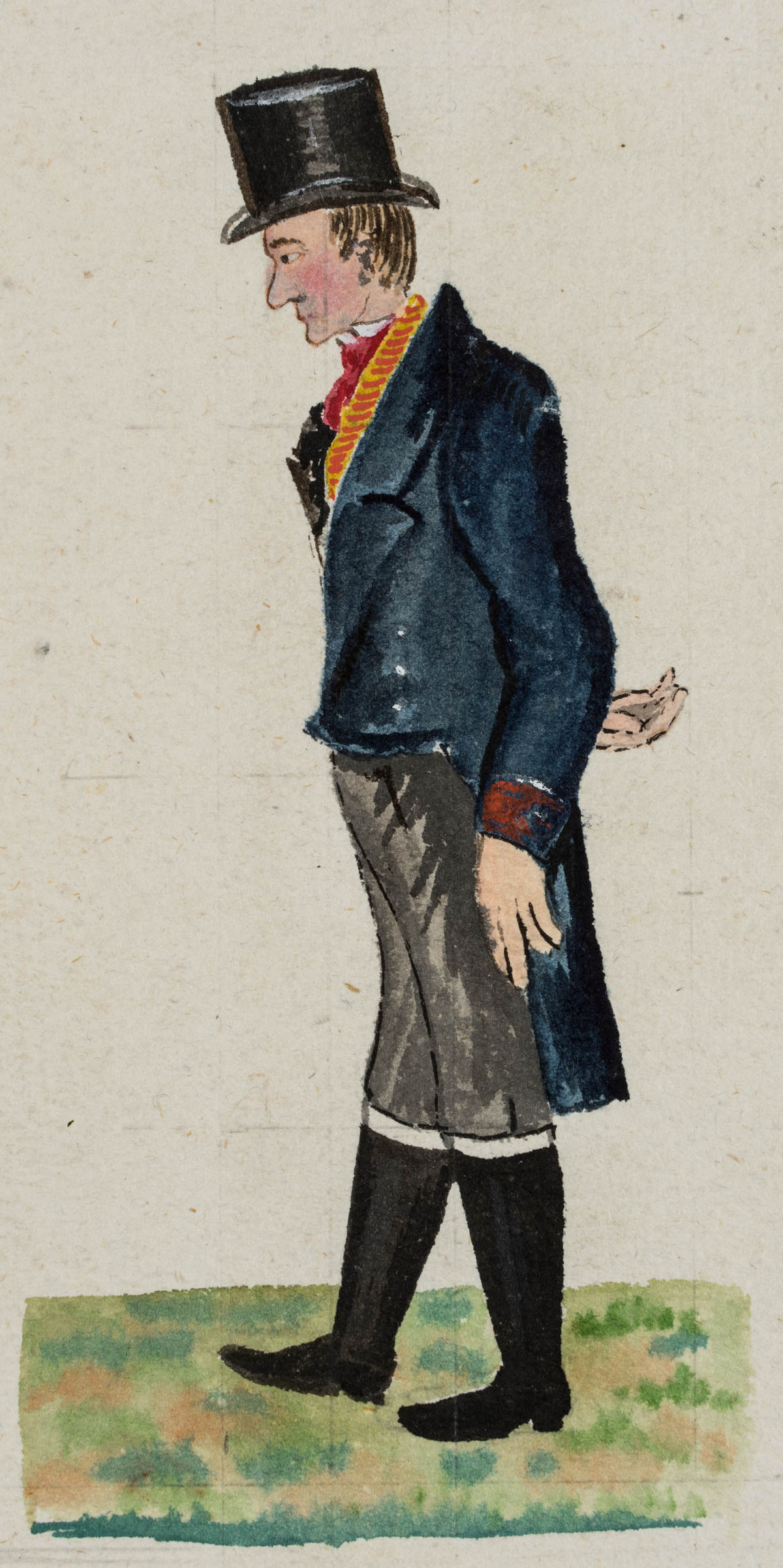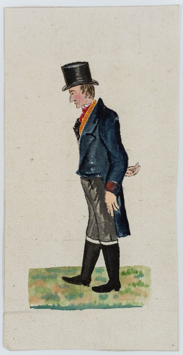 Unknown (19th century), Thoughtful striding gentleman in frock coat with top hat, c. 1830, Watercolor