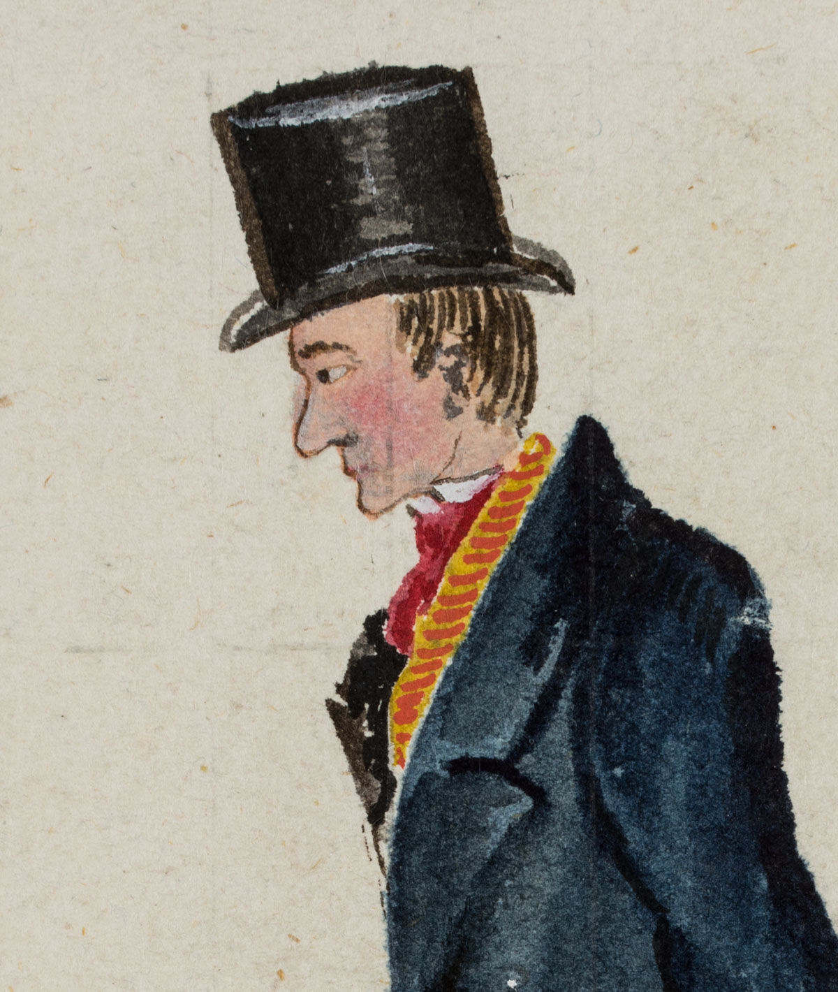 Unbekannt (19. Jahrhundert), Nachdenklich ausschreitender Herr im Gehrock mit Zylinder, um 1830, Aquarell