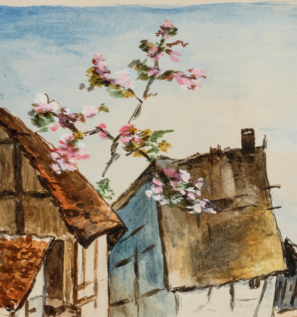 - Description: Colourful depiction of a small village with half-timbered houses, between which a pink blossoming cherry tree branch stands out.